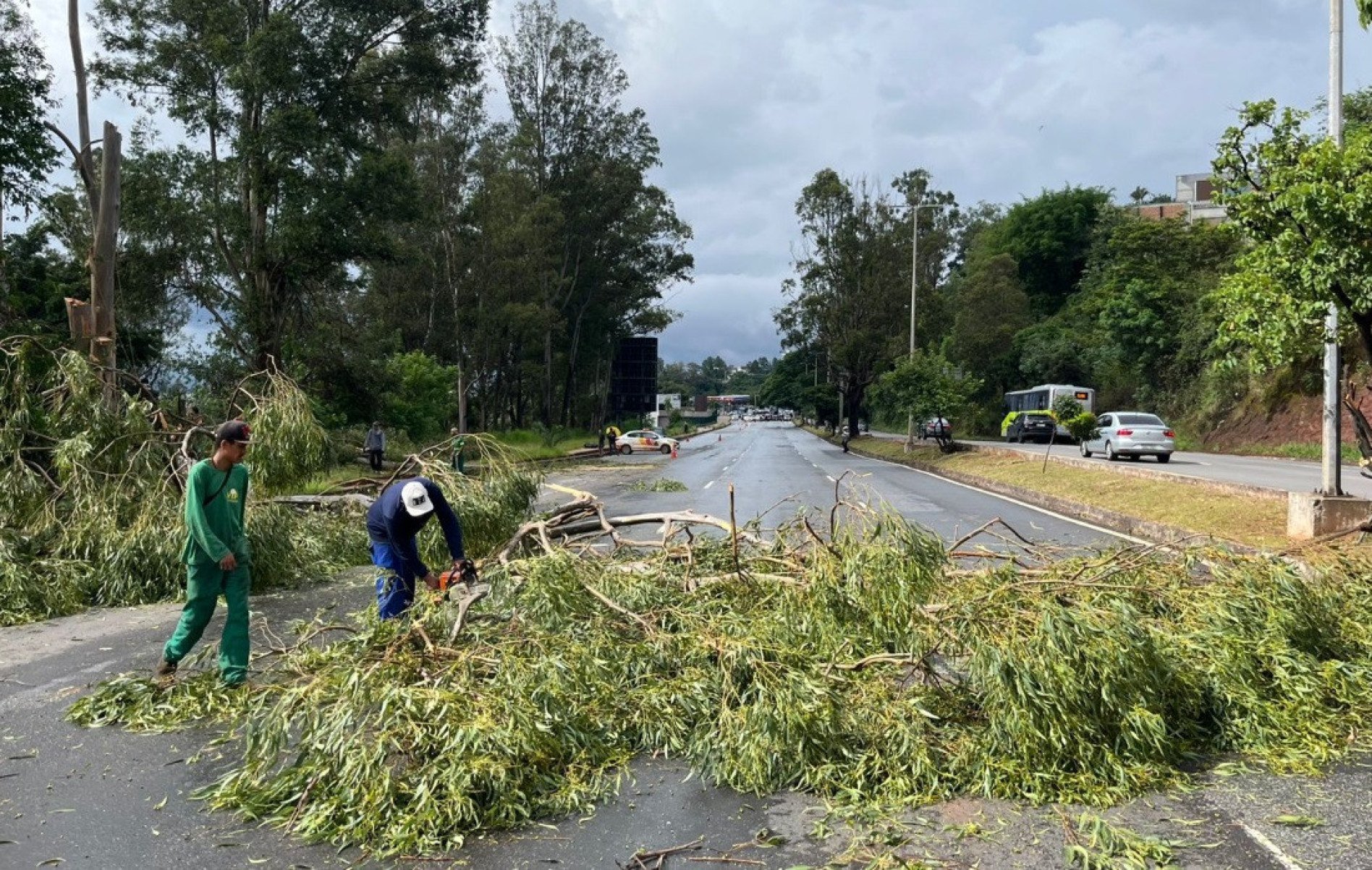 Com a chuva intensa na região, motoristas devem redobrar a atenção, já que há galhos e folhas espalhados pela pista.
