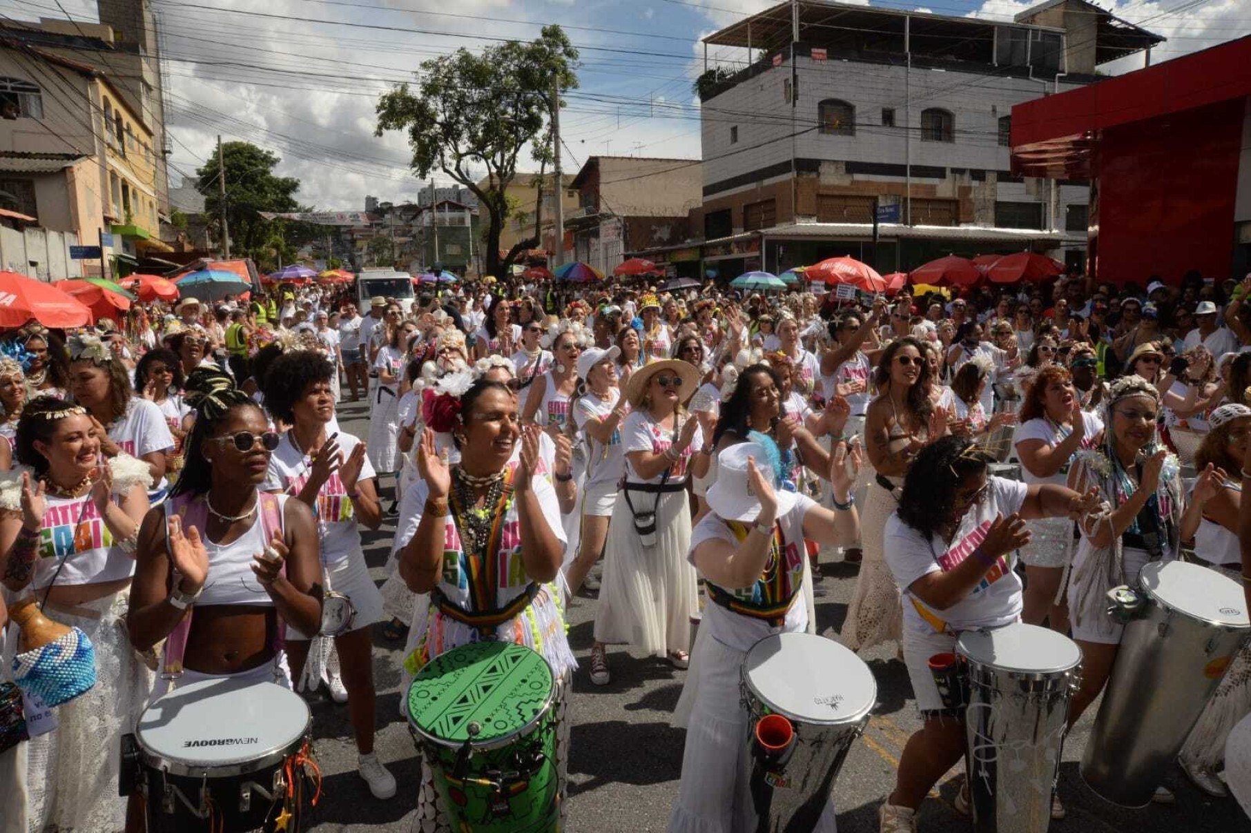 O bloco, criado em 2019 para homenagear Clara Nunes (1942-1983), desfilou pela rua que leva o nome da sambista mineira com uma bateria composta por 100 mulheres.