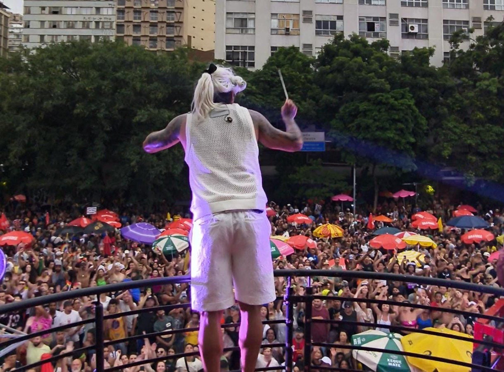 Do alto do trio, o vocalista da Banda Eva, Felipe Pezzoni, agitava o cortejo do bloco Beleza Rara com muita energia neste domingo de pós-carnaval (22/2), na Avenida dos Andradas, no Centro de Belo Horizonte. Em certo momento, ele colocou uma peruca à moda vitoriana e regeu o público ao som de “Eva sinfonia”.