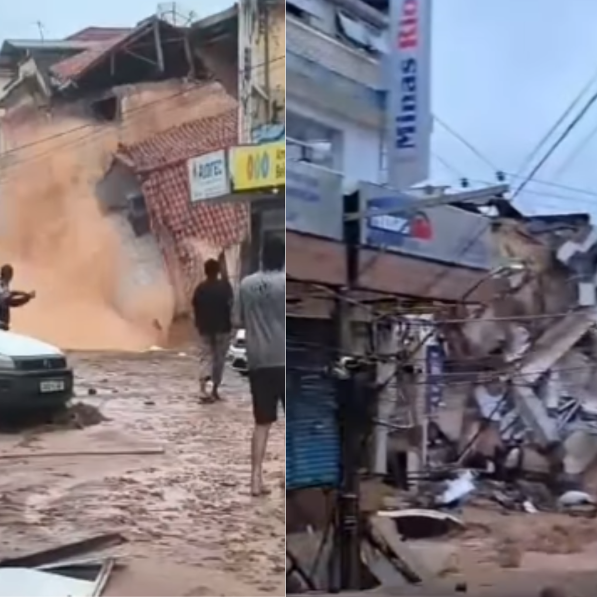 Um dos imóveis era ocupado pela loja Minas Rio Varejo. Do outro lado da via, funcionava uma concessionária de carros e na parte superior do prédio havia casas residenciais. Com a força da enxurrada, a rua foi aberta e o leito de um rio que passa sob a via ficou exposto, o que pode ter comprometido a base das construções.
