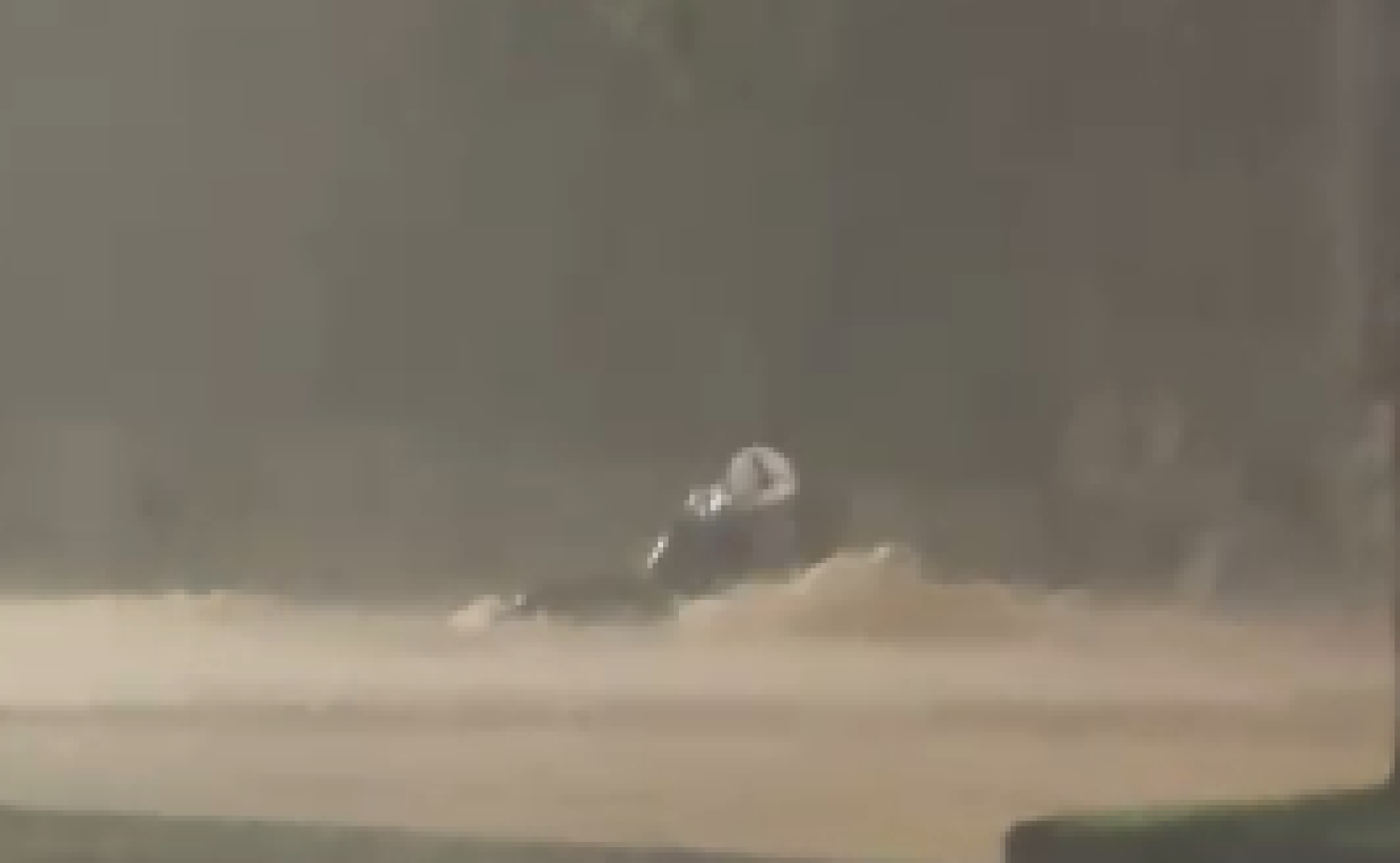 Um vídeo que circula nas redes sociais mostra o momento em que um motoboy é arrastado pela enxurrada durante o temporal que atingiu Juiz de Fora (MG), na Zona da Mata, na noite dessa quarta-feira (25/2).