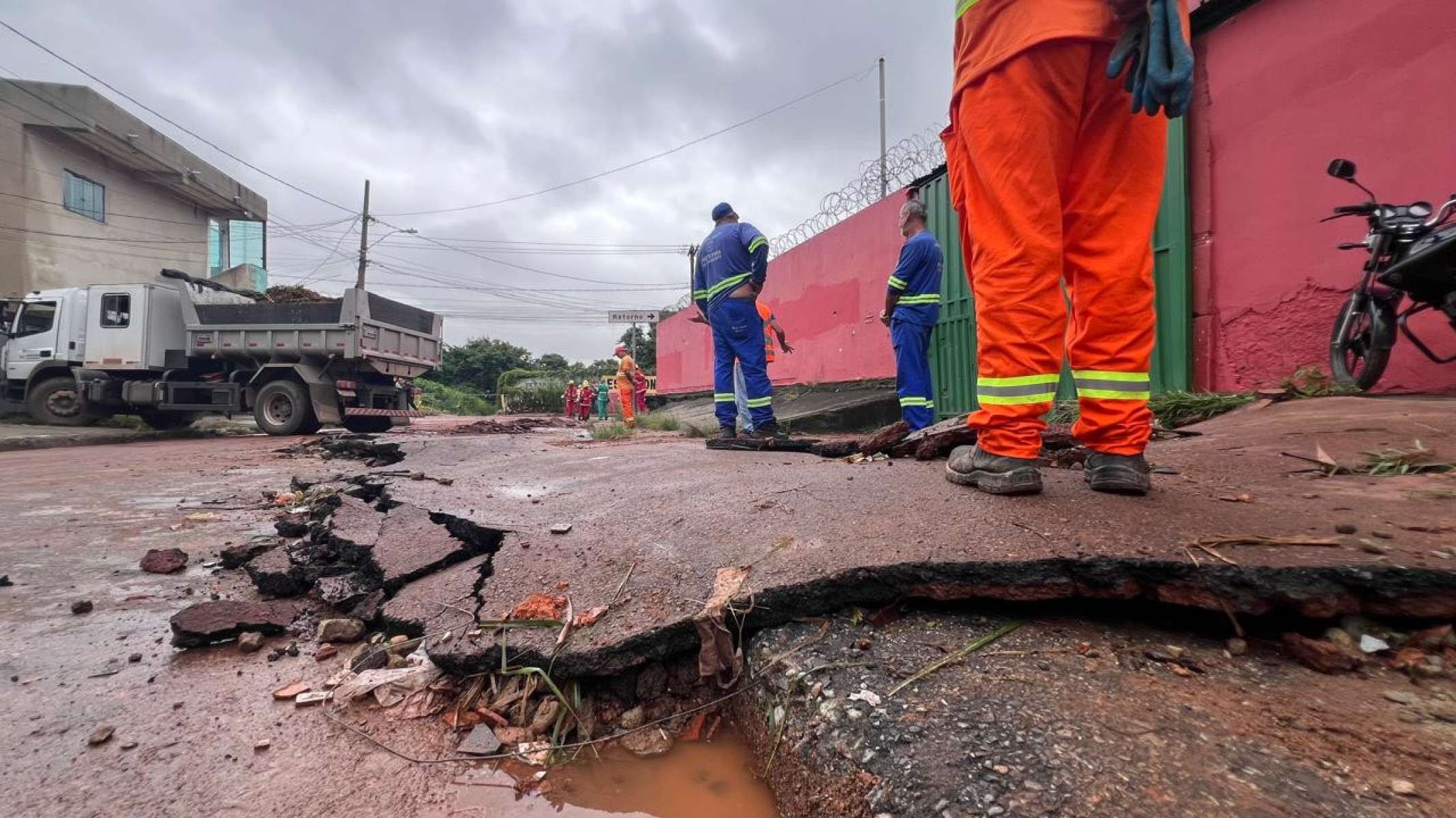Pela manhã, era possível ver crateras abertas na Avenida Agenor Nonato de Souza, onde o portão foi levado pela água. Equipes da prefeitura realizam a limpeza da via, retirando lama e pedaços de asfalto arrancados pelo temporal.