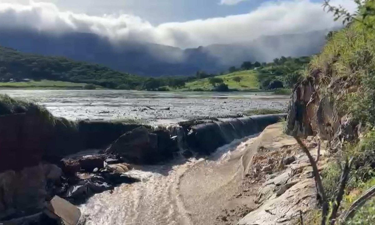 Em vídeo divulgado pelos bombeiros, é possível ver a barragem em seu nível máximo e um volume de água seguindo pelo vertedouro, uma estrutura semelhante a um canal.