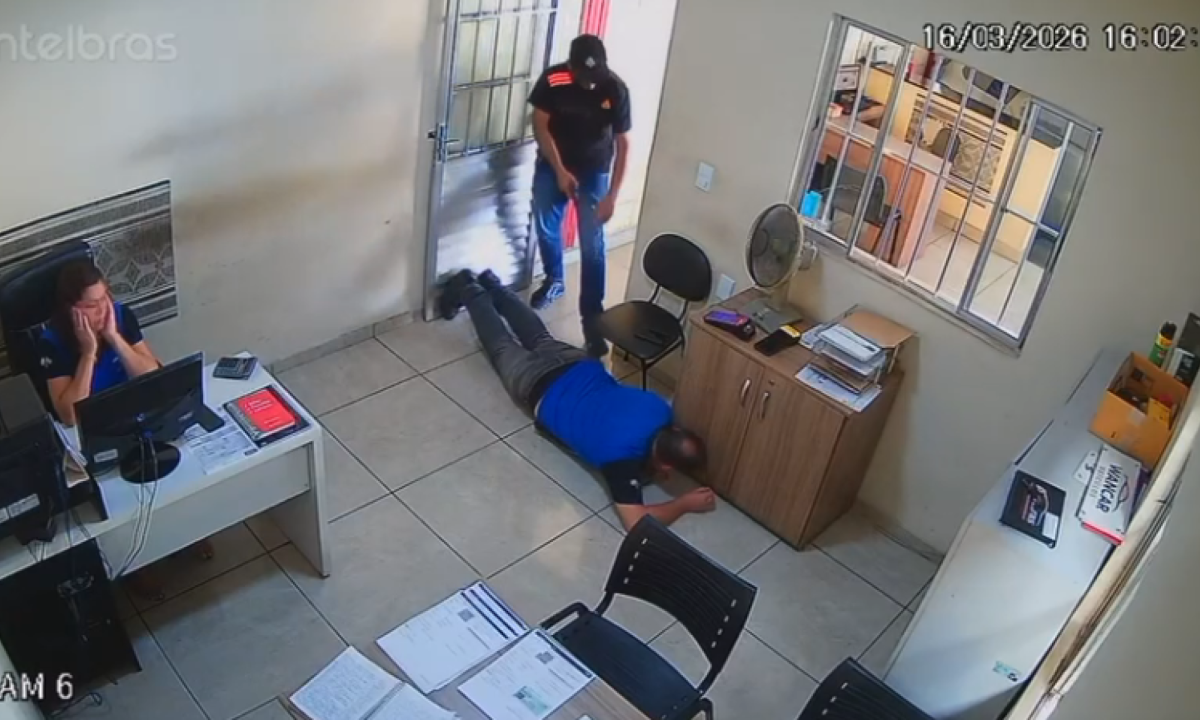 Nas imagens, um dos suspeitos, vestindo camisa e boné preto, aparece sacando uma arma e anunciando o assalto pela janela do escritório. Em seguida, ele entra no local e rende as vítimas.