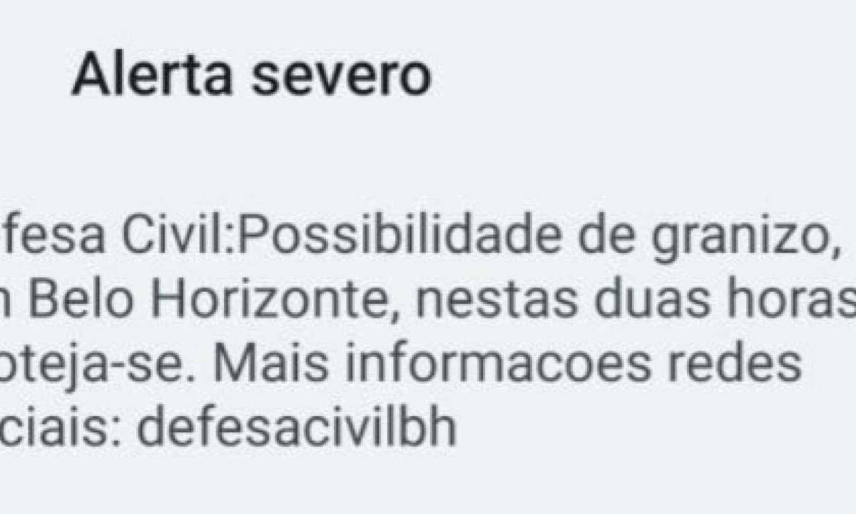 Todas as regiões de Belo Horizonte estão em alerta para granizo na noite desta quinta-feira (19/3). O alerta foi emitido pela Defesa Civil municipal por volta das 18h50. O aviso é válido para as próximas duas horas.