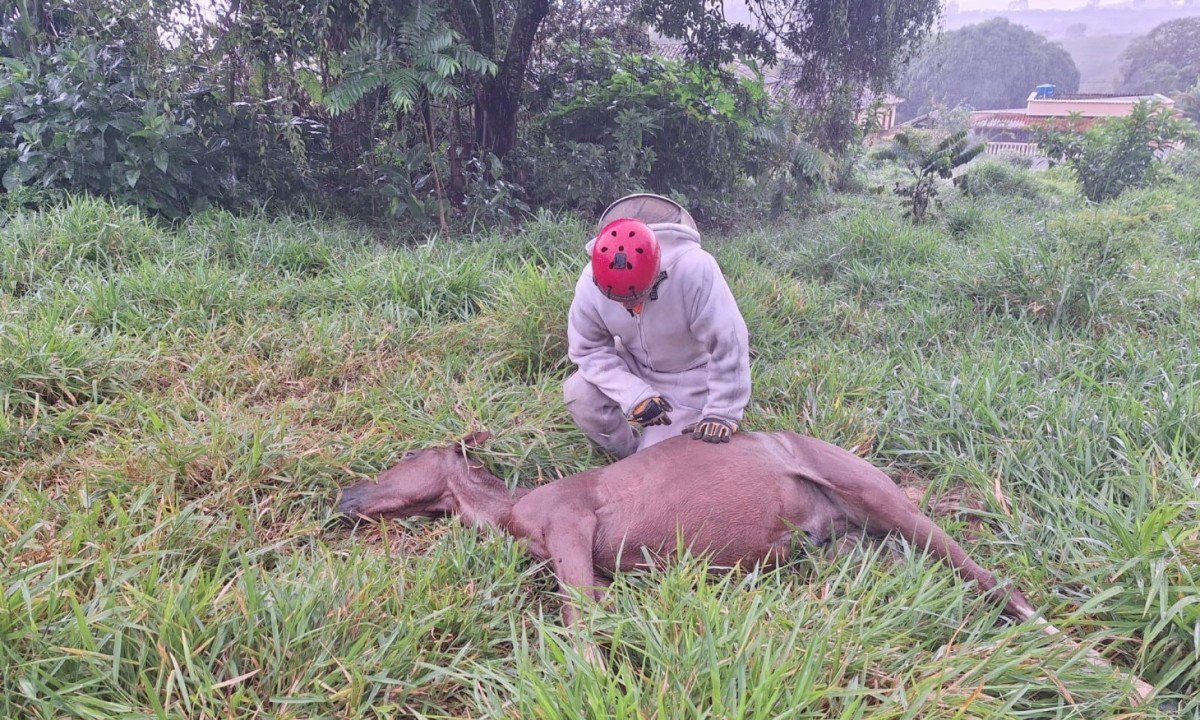 Os bombeiros se deslocaram imediatamente ao local e, com o apoio de populares, identificaram a área onde os animais estavam sendo atacados. Um deles foi achado morto e o outro recebeu atendimento de médicos veterinários, mas também não resistiu.