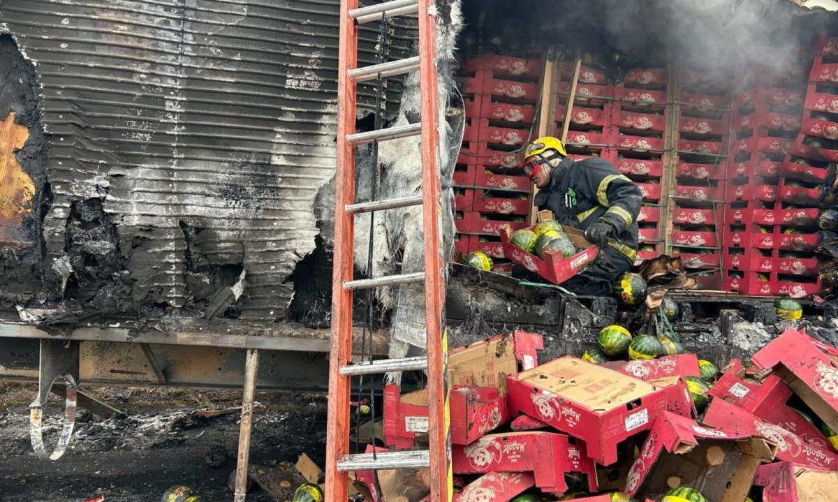 O condutor da carreta saiu ileso, mas as chamas destruíram o semirreboque e a carga de melancias, criando risco de propagação para a vegetação às margens da via.