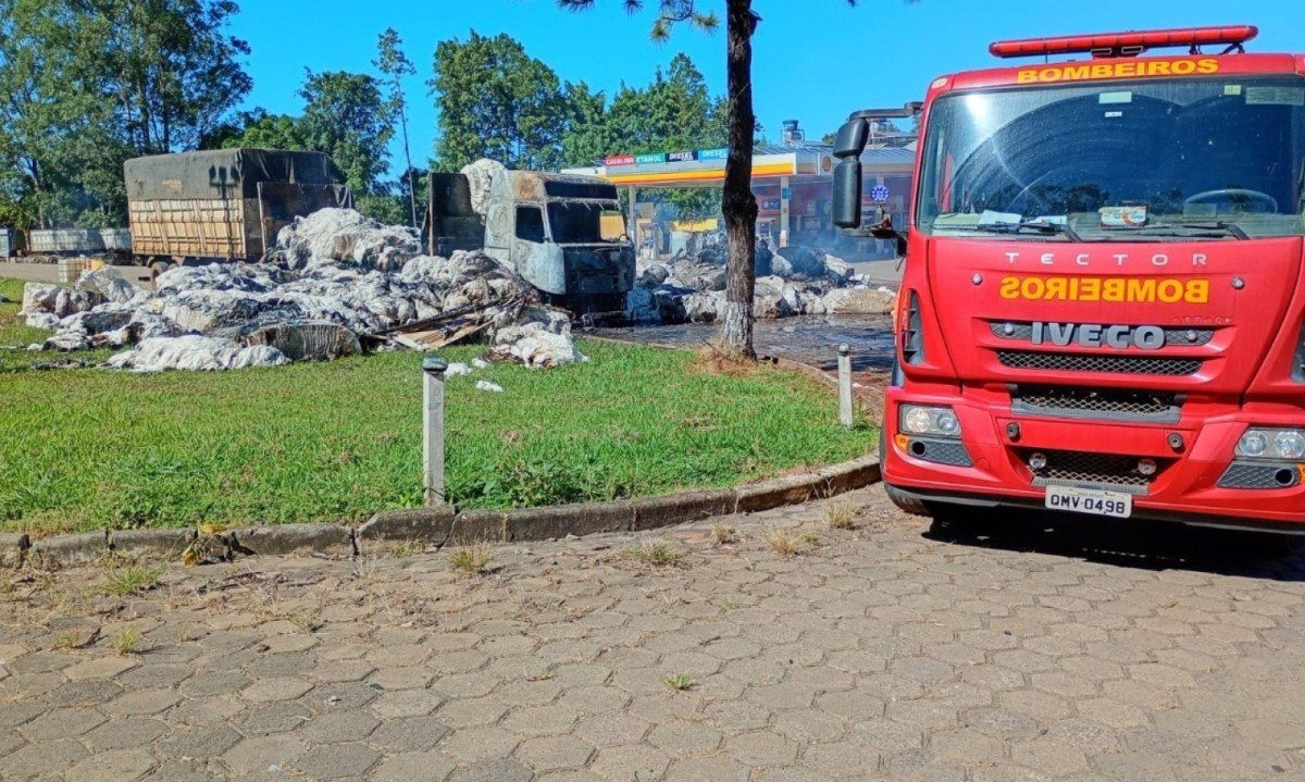 Uma carreta carregada de algodão pegou fogo na madrugada desta segunda-feira (30/3) na MGC-491, próximo ao Km 33, altura de Monte Santo de Minas (MG), na Região Sudoeste do estado. O veículo estava estacionado no pátio de um posto de gasolina no momento do incidente.
