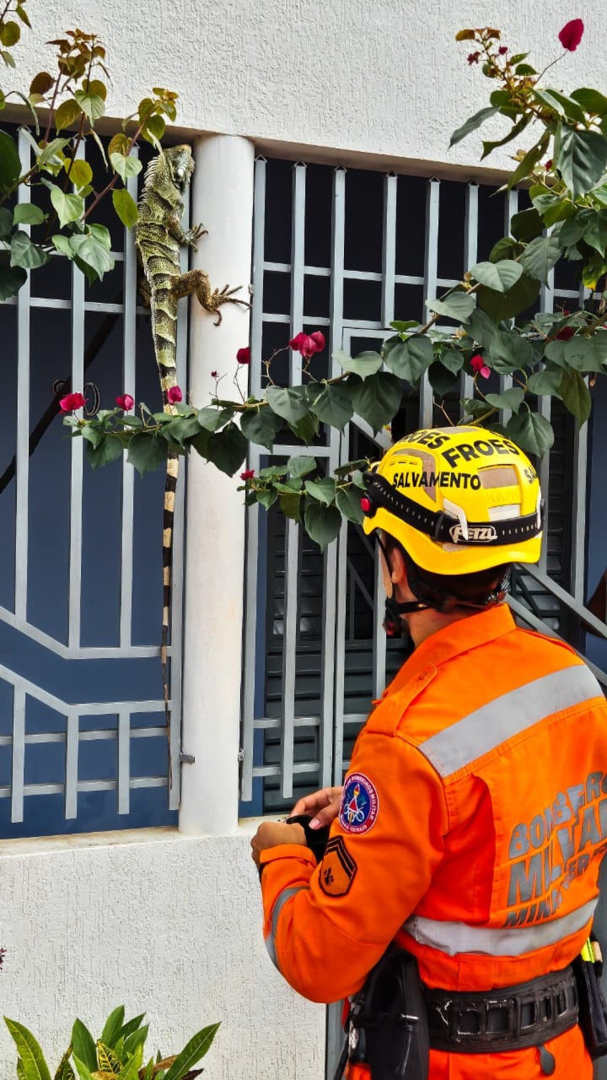 Uma iguana de grande porte mobilizou o Corpo de Bombeiros na manhã dessa quarta-feira (4/3), no distrito de Riacho da Cruz, em Januária, no Norte de Minas. O animal, que mede cerca de 1,80 metro de comprimento, estava na grade do portão de uma residência e acabou assustando a moradora.