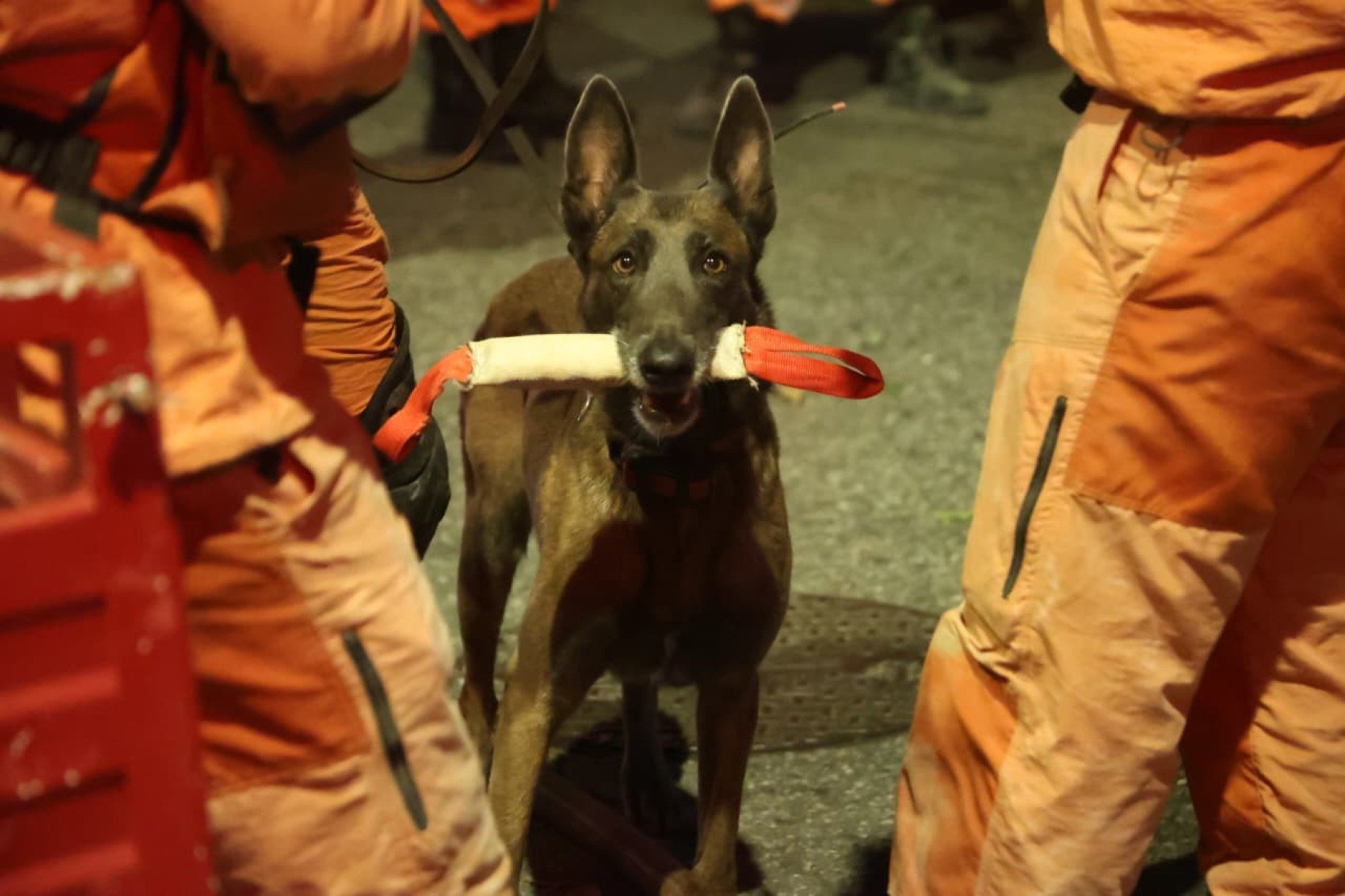 Ao longo do dia, três cachorros foram empenhados nos trabalhos de resgate: todos encontraram vítimas em meio aos escombros da Casa de Repouso Pró-Vida. Um deles é a cadela Áquila, que, bem como os demais, utiliza uma coleira equipada com GPS para ajudar na localização em meio aos escombros.
