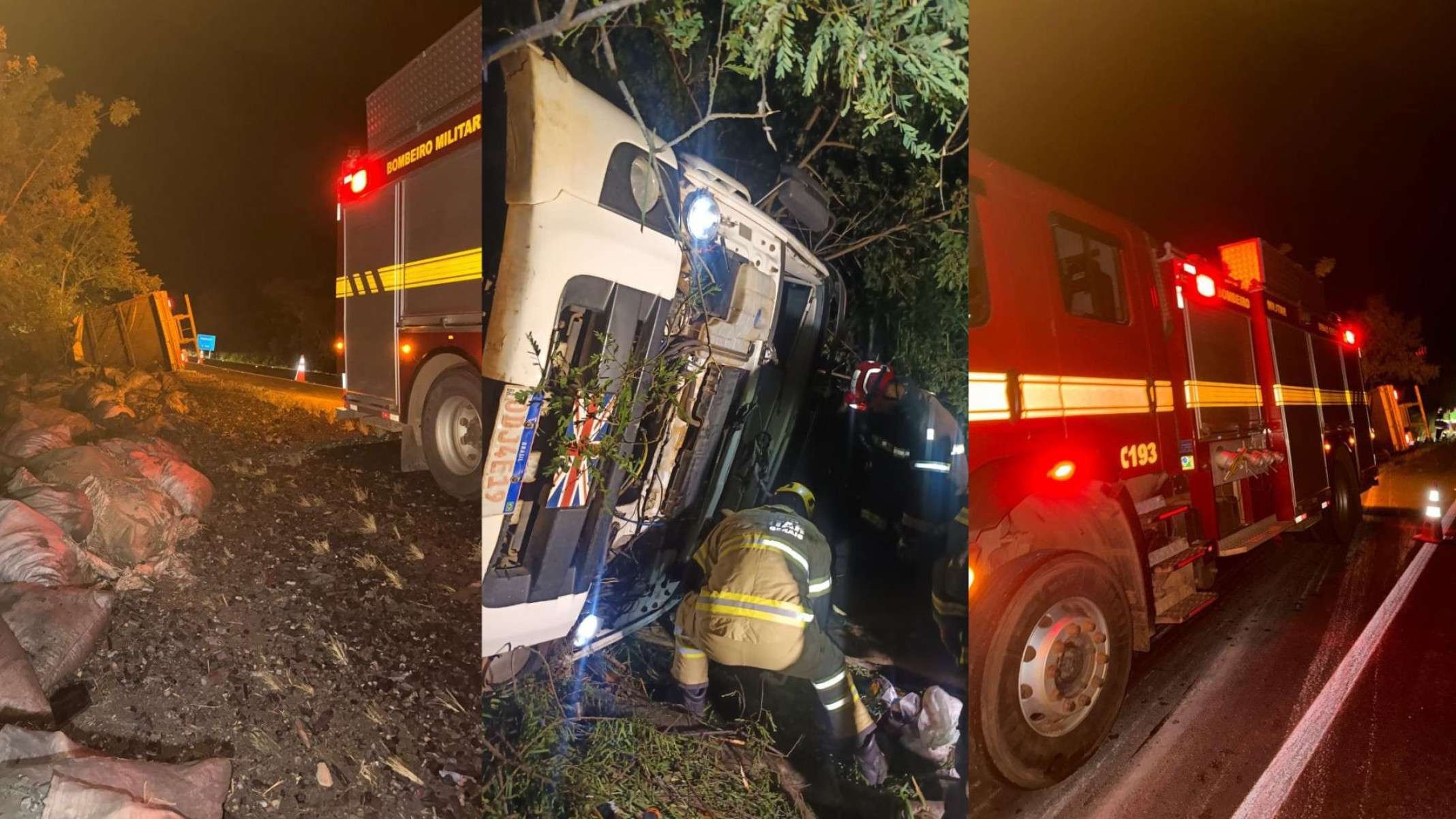 Segundo o Corpo de Bombeiros, o caminhão tombado parou fora da pista de rolamento, com a carga de carvão e objetos pessoais espalhados fora da pista de rolamento.