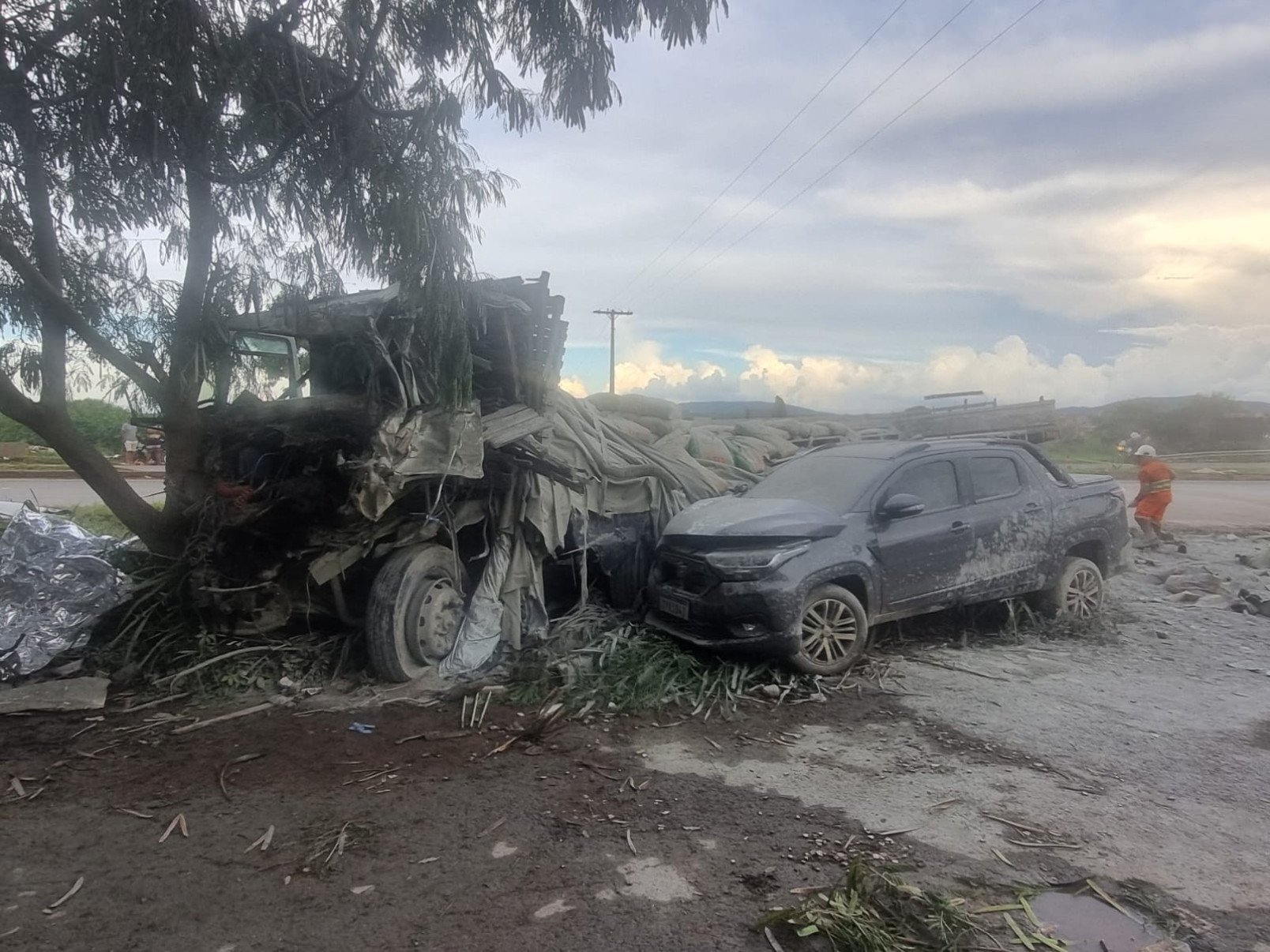 Após o choque com os outros veículos, o caminhão carregado de cimento tombou e ainda bateu em uma árvore. O motorista do caminhão, de 52 anos, morreu na hora, e a carga de cimento derramou na lateral da pista. A carga seguia de Vespasiano (Região Metropolitana de Belo Horizonte) para a Bahia, estado onde nasceu o motorista que perdeu a vida na tragédia.
