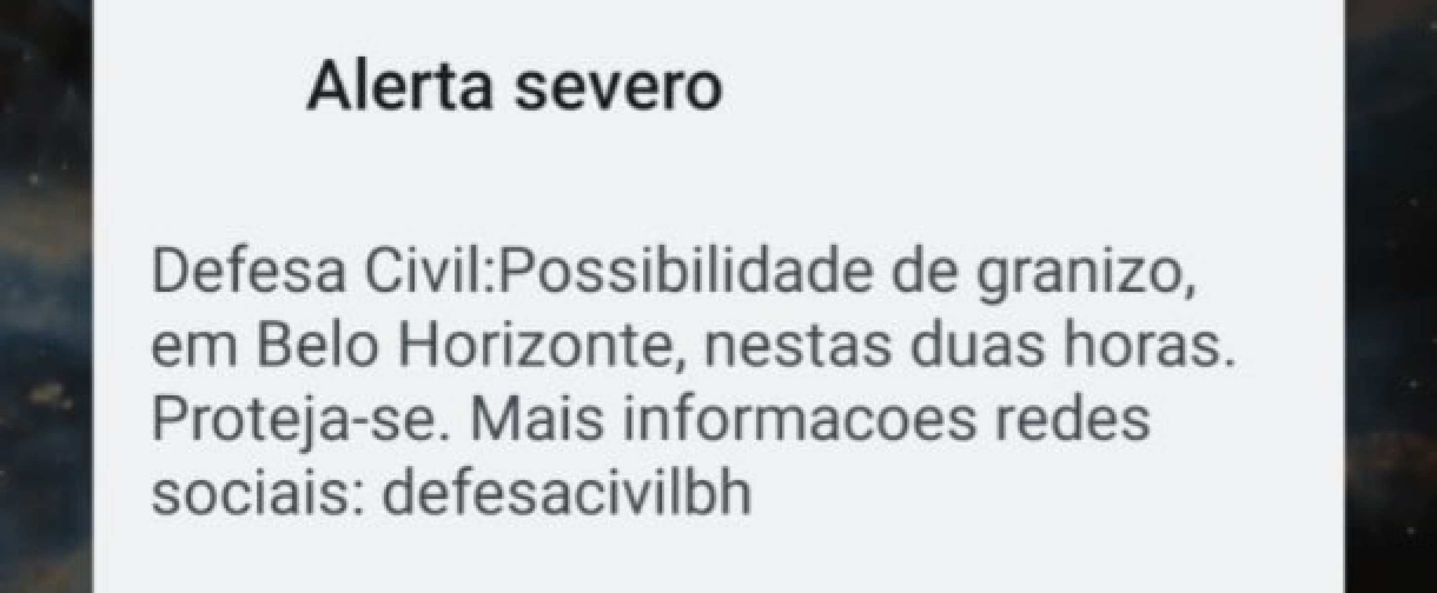 Todas as regiões de Belo Horizonte estão em alerta para granizo na noite desta quinta-feira (19/3). O alerta foi emitido pela Defesa Civil municipal por volta das 18h50. O aviso é válido para as próximas duas horas.