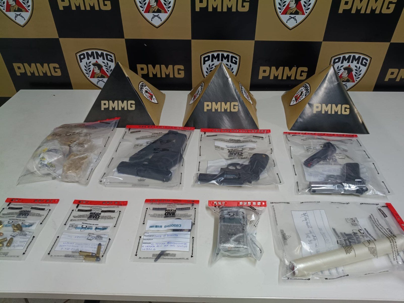 Os policiais foram até a casa de uma namorada do suspeito, o identificaram e o encontraram bebendo em um bar. Ele recebeu voz de prisão em flagrante. Na casa do suspeito, os militares encontraram uma mochila preta com duas pistolas, carregadores e munição. Um revólver estava dentro de uma caixa de sapatos, além de drogas e balanças de precisão.