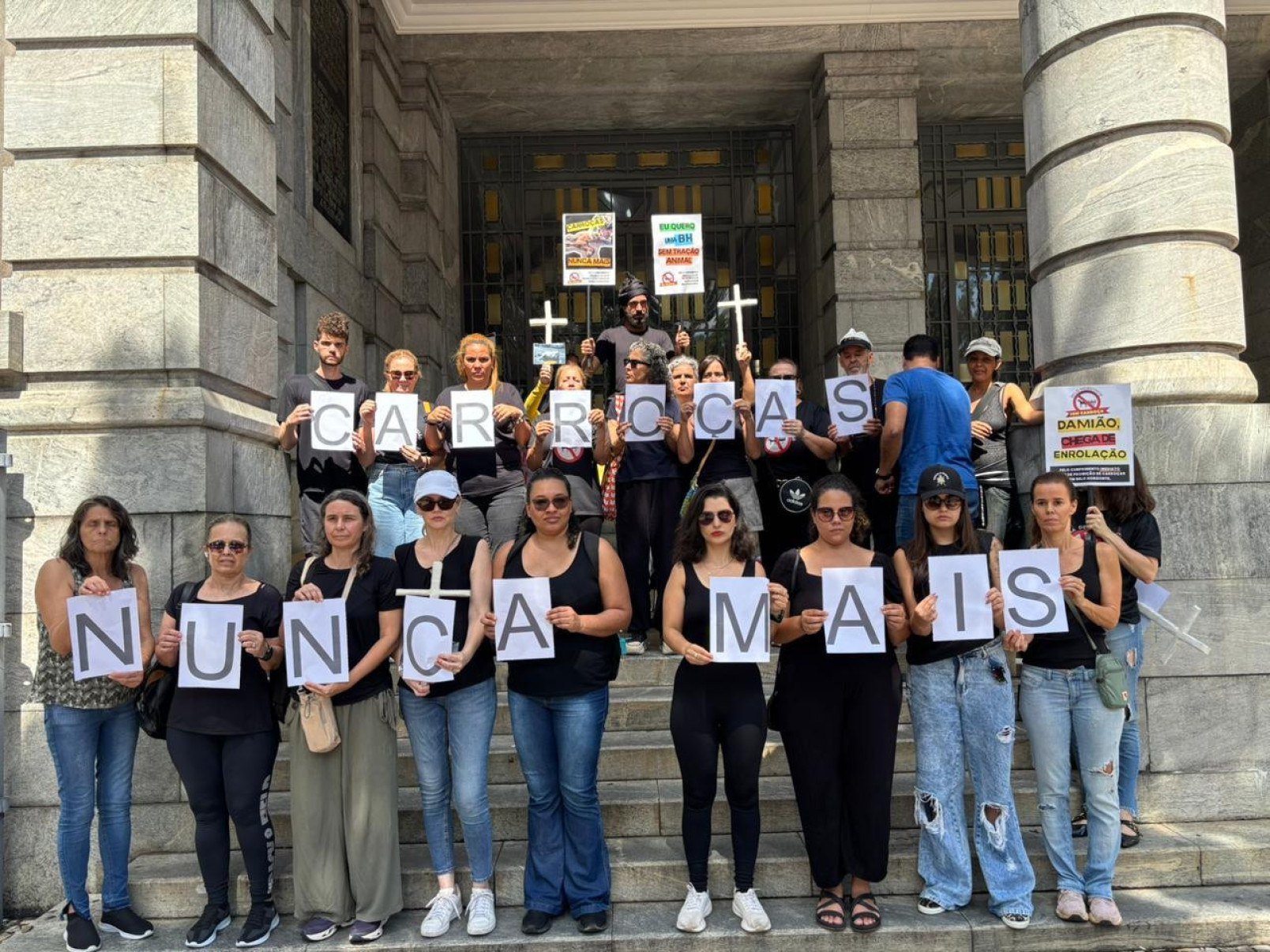 Segurando cartazes, cruzes e fotos de animais, os manifestantes gritavam: “Carroças nunca mais.”