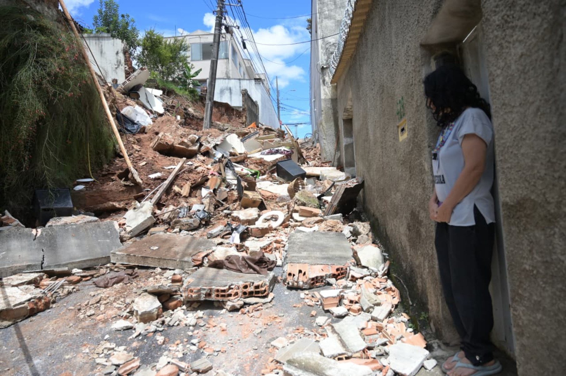 Ela também relatou preocupação com um poste localizado entre os muros, que ficou inclinado após o desabamento. “Esse poste está tombando. Parece que vai precisar ser trocado. A Cemig precisa vir resolver”, disse.
