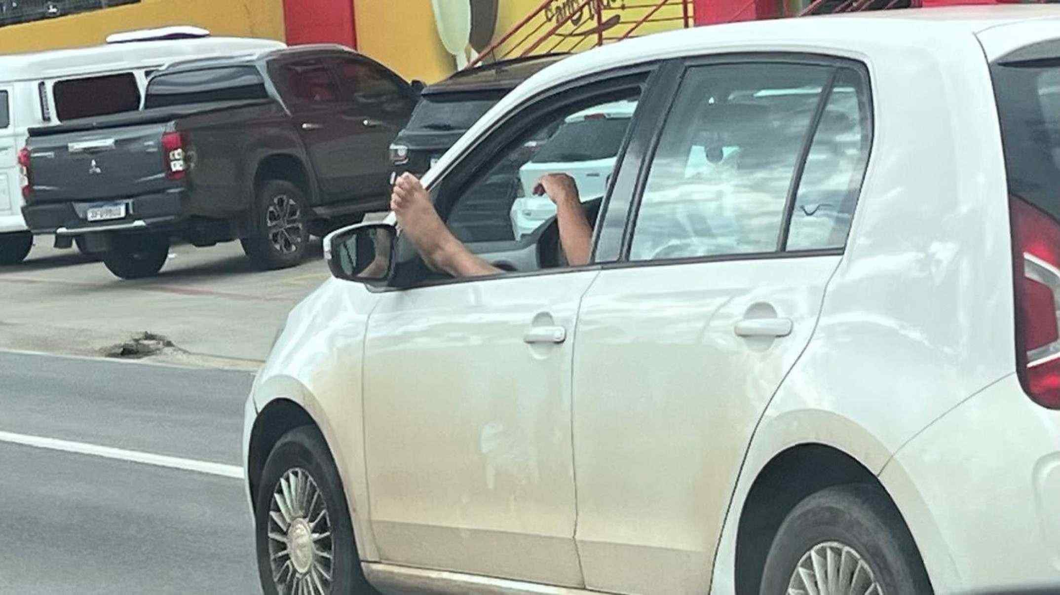 Um homem foi flagrado com o pé e a mão esquerdos do lado de fora da janela do carro enquanto dirigia na movimentada Via Expressa, na altura do Bairro Água Branca, em Contagem, na Grande BH, por volta das 14h50 desta quarta-feira (25/3).