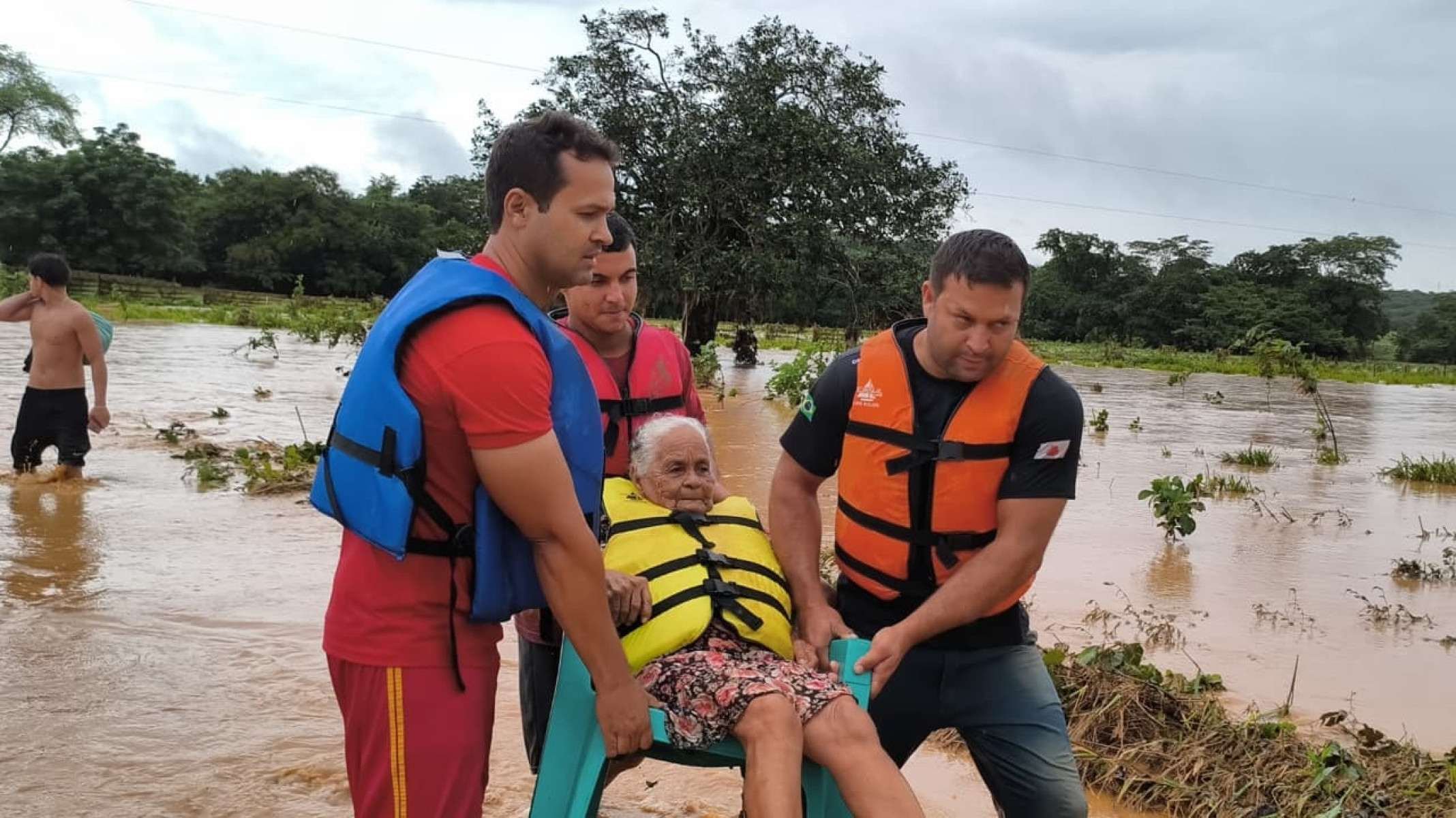 Na mesma localidade, os bombeiros e a Defesa Civil resgataram uma idosa, de presumíveis 80 anos, com mobilidade reduzida, que teve a casa inundada e ficou ilhada. Também numa situação curiosa, antes da chegada das equipes de salvamento, parentes da mulher a colocaram em uma cadeira amarrada com uma corda em um caibro do telhado para evitar que ela fosse levada pela força da correnteza. Na residência foram socorridos ainda o marido da mulher, também idoso, e um neto do casal.