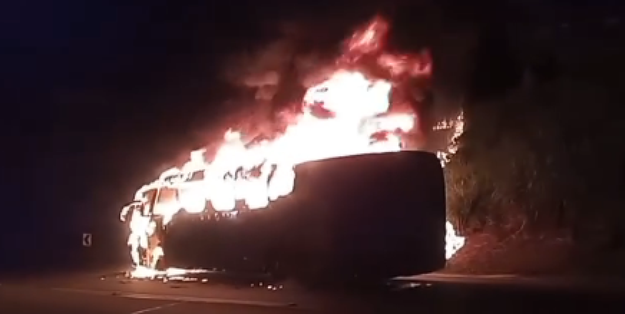 Devido ao impacto, o coletivo foi tomado pelas chamas, o que levou à interdição da rodovia durante o atendimento da ocorrência pelo Corpo de Bombeiros.