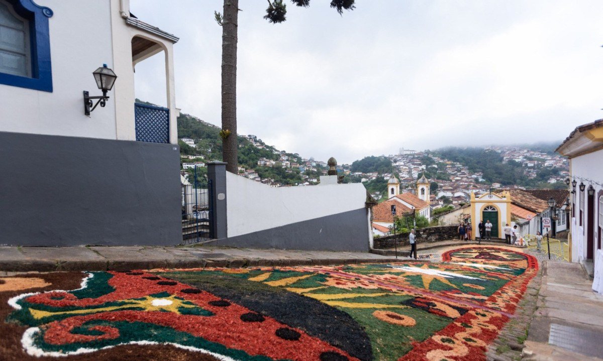 Neste ano, foram usadas 15 toneladas de serragem colorida, que se juntam a materiais (cal, pó de café e flores) para compor os desenhos. “A prefeitura atua na organização da estrutura necessária para o evento. É responsável por toda a logística, desde a obtenção e coloração da serragem, até a distribuição nos pontos estratégicos. E ainda pela organização da cerimônia e da limpeza das ruas após a passagem”, disse o secretário Municipal de Cultura e Turismo de Ouro Preto, Flávio Malta.