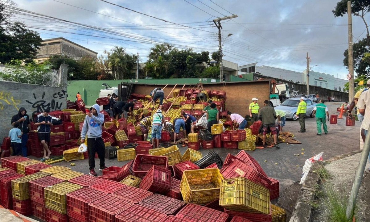 Na manhã desta segunda-feira, um guincho atuava no destombamento do veículo, enquanto populares saqueavam a carga espalhada pela via.