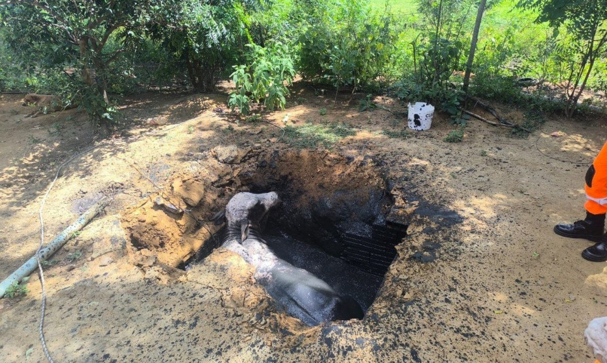 A fossa, ativa, tem aproximadamente 1,5 metro de profundidade; o boi foi resgatado com vida e sem ferimentos aparentes