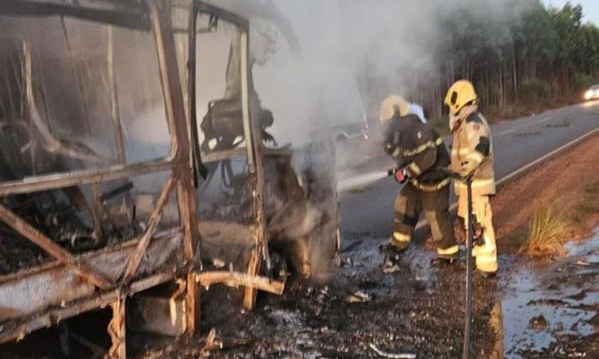 Veículo transportava 28 pessoas e ficou totalmente destruído. Passageiros desceram a tempo, e ninguém se feriu