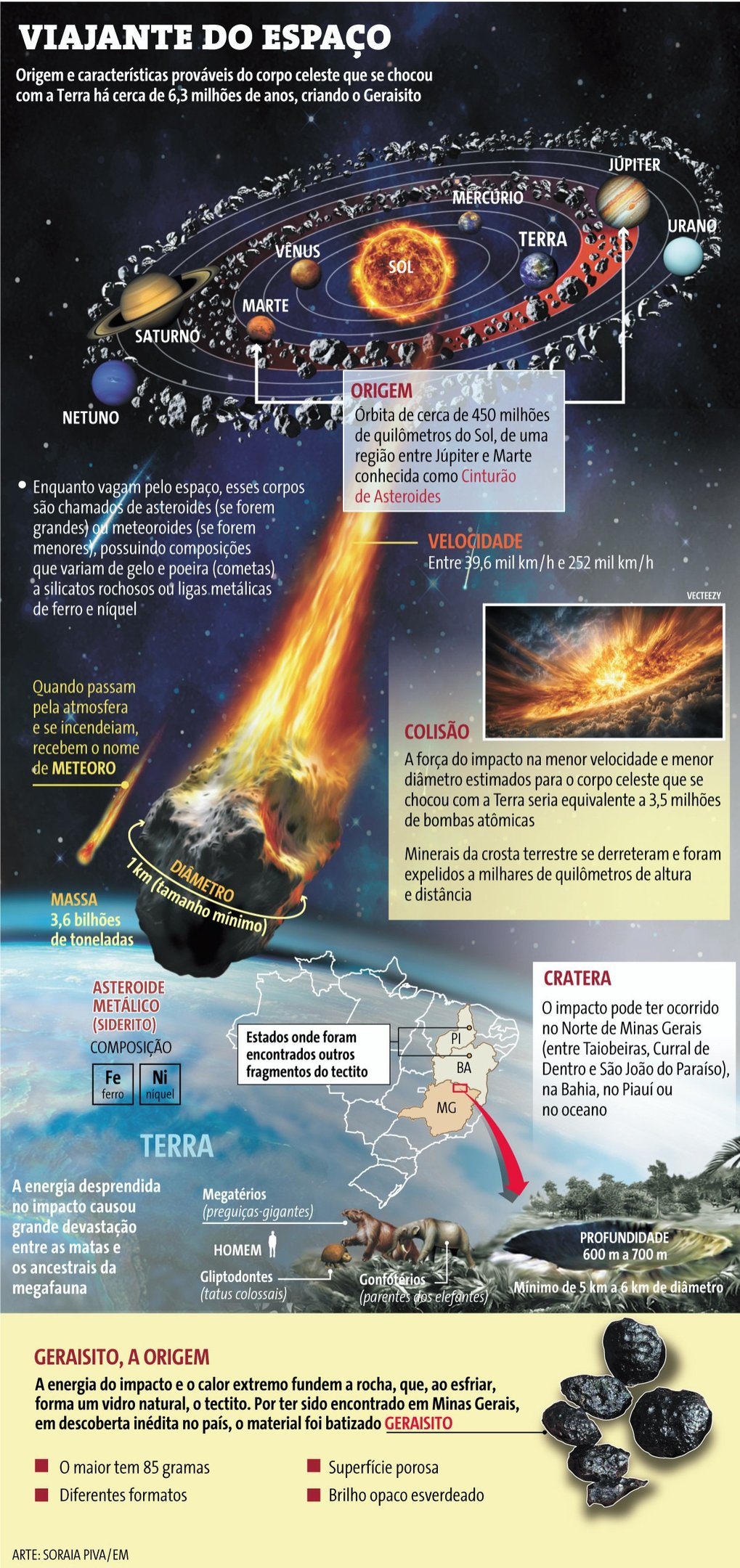 A formação do Geraisito é apenas a parte mais rápida da história, já que o corpo celeste que colidiu contra a Terra há mais de 6 milhões de anos pode ter vindo de muito longe (veja arte na página ao lado). Pode se tratar de um cometa, mas a professora Maria Elizabeth Zucolotto, da UFRJ, astrônoma responsável pelo Setor de Meteorítica do Museu Nacional do Rio de Janeiro, diz que geralmente os impactos no planeta vêm de asteroides que têm uma órbita a cerca de 450 milhões de quilômetros do Sol, originários de uma região entre Júpiter e Marte conhecida como Cinturão de Asteroides.