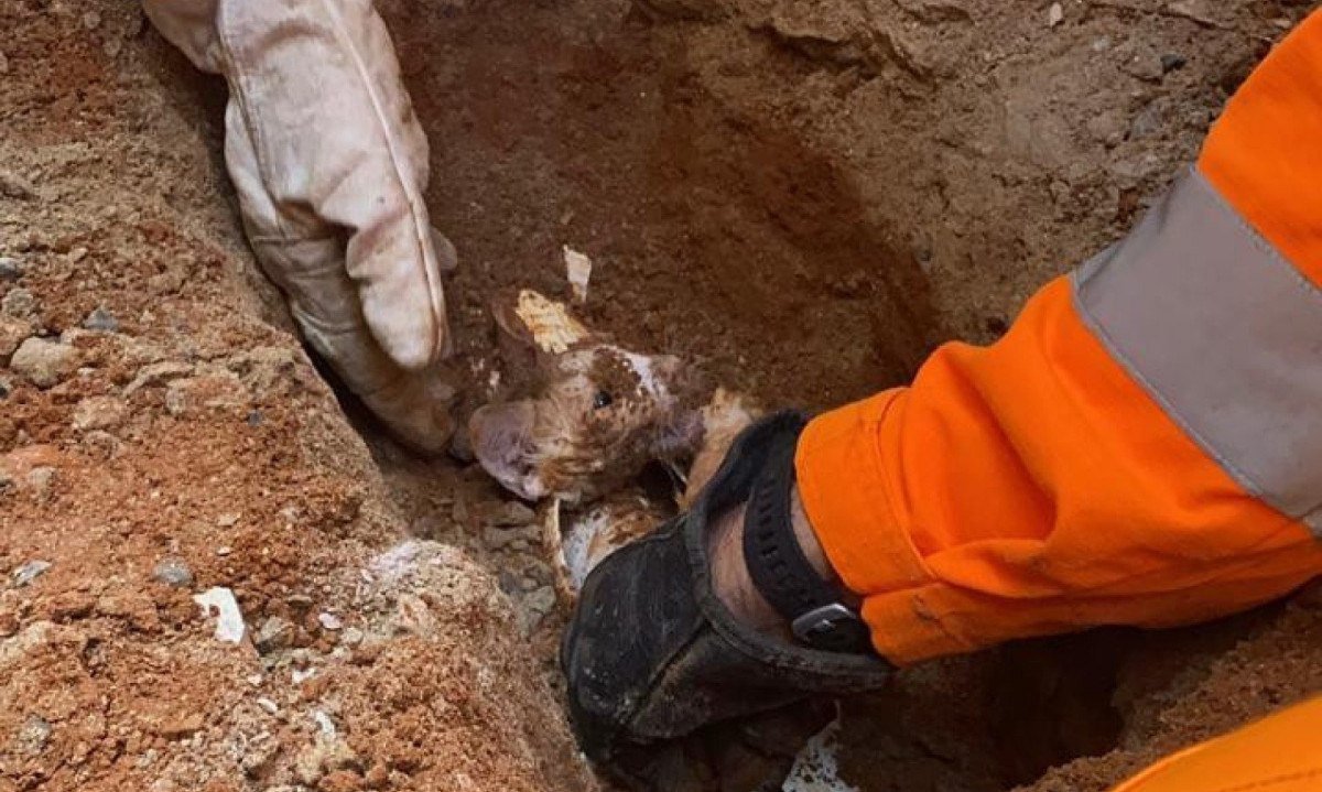 Após localizar o ponto exato onde o animal estava, os bombeiros quebraram parte do piso e fizeram a escavação necessária para acessar a tubulação. Em seguida, Branquinho foi retirado em segurança e devolvido à família.