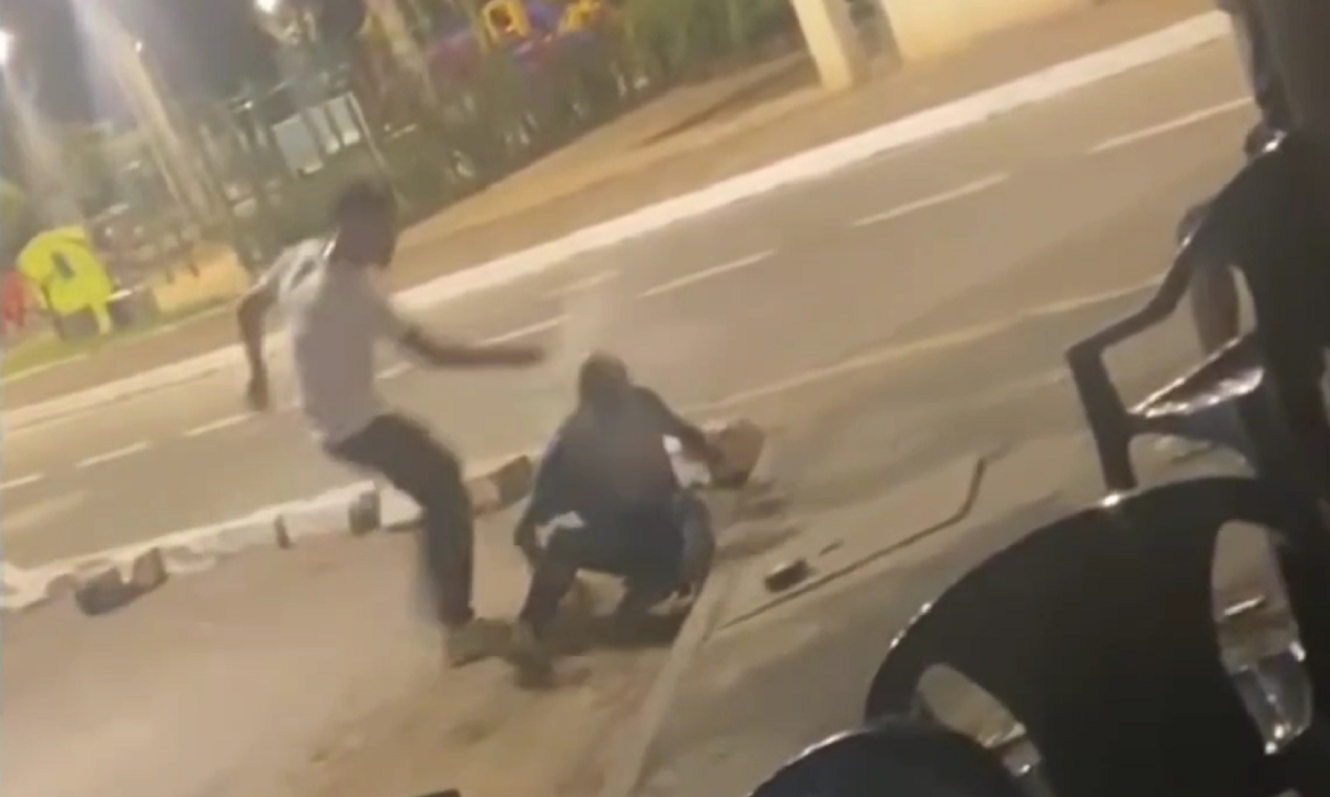 O sistema de monitoramento policial teria percebido quando a vítima foi atingida com socos enquanto estava no meio da rua. Em seguida, outro homem aparece quebrando uma garrafa na cabeça do agredido.