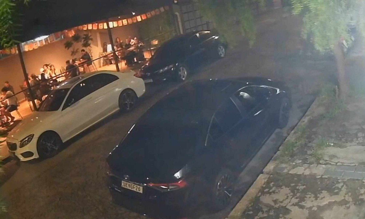 Imagens captadas por outra câmera de segurança mostram os dois responsáveis pelo duplo homicídio fugindo do local em um Ford Ka prata.