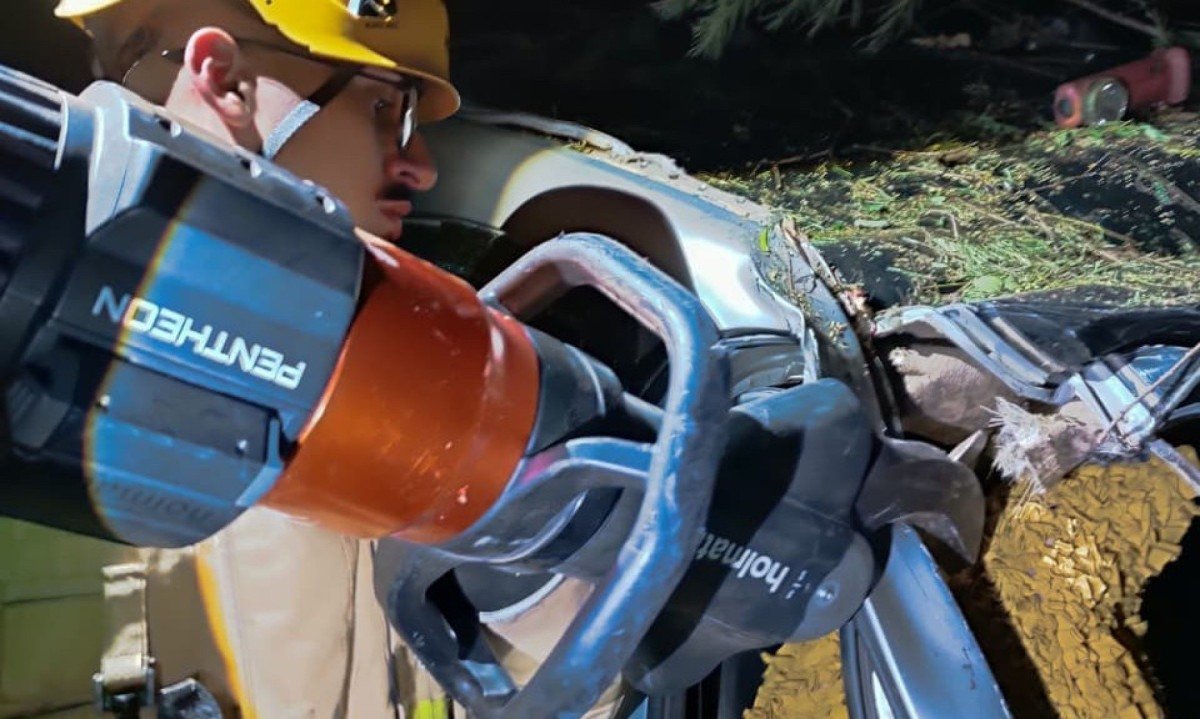 Para remover a mulher de dentro do veículo foi necessário utilizar equipamentos de desencarceramento, cortando partes específicas da lataria para liberar a vítima com segurança.