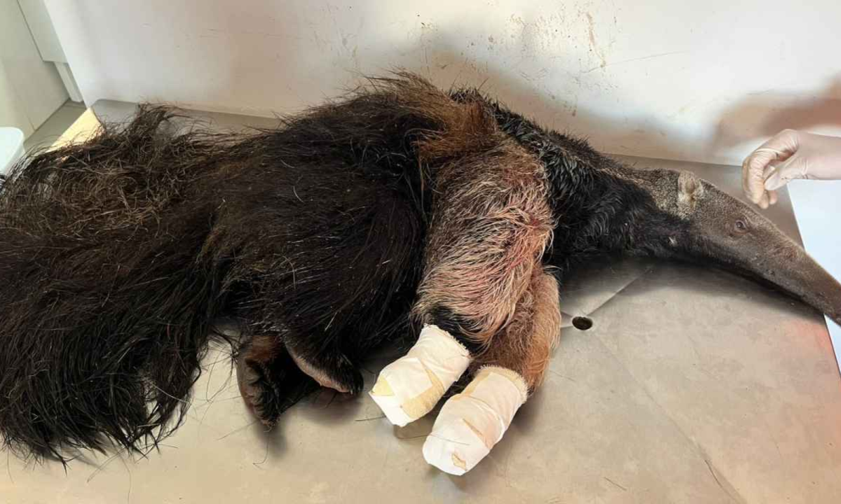 Tamanduá-bandeira adulta não resistiu aos ferimentos após ser atingida na MGC-265, no Sul de Minas. Filhote foi encaminhado à clínica veterinária da região