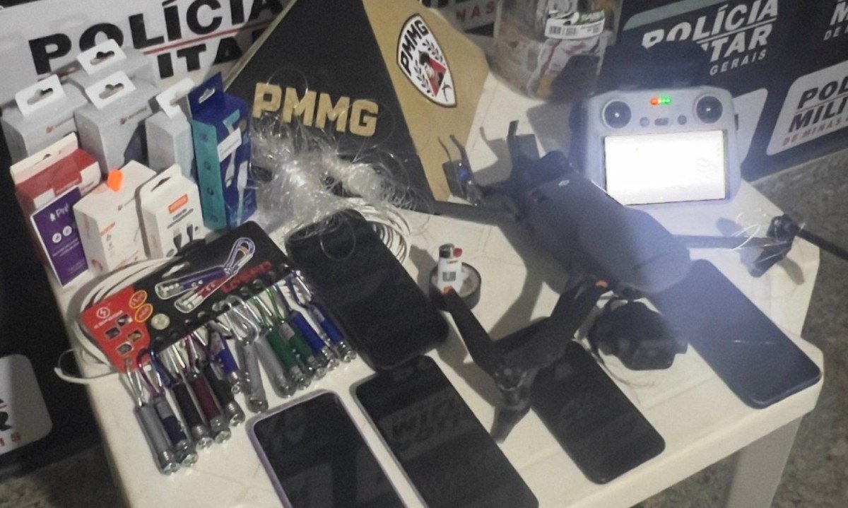 Em buscas nas imediações, policiais encontraram uma sacola com aparelhos celulares dentro — cuja quantidade total não foi informada — carregadores, cabos, lasers, um chip de telefonia e outros materiais utilizados na ação. Assim como o drone, modelo Mavic 3 Classic, os objetos foram apreendidos.
