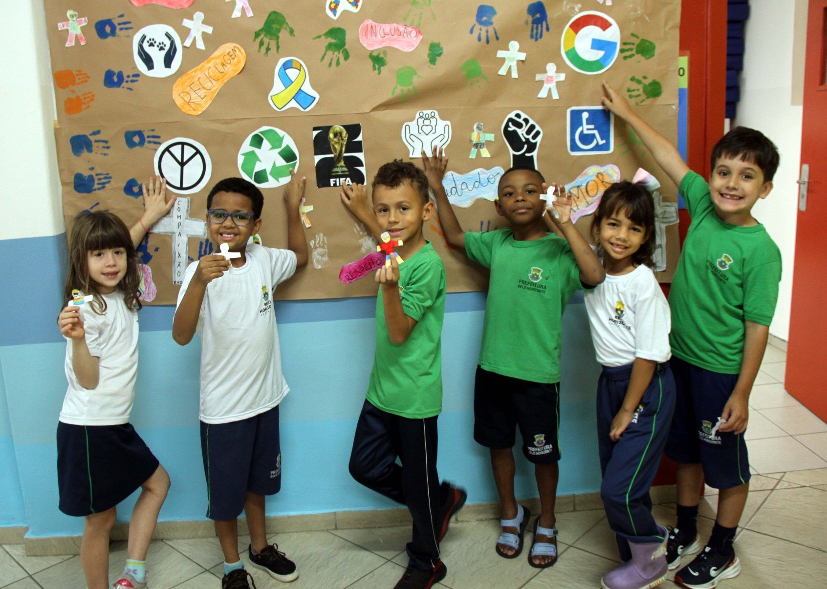 Então, vamos à paz, segundo as crianças. “A paz é construída”, aprenderam Júlia, Wesley, Matheus Terra de Deus, Mateus Ângelo, Malu e Pietro, todos de 7 anos, alunos do segundo ano do ensino fundamental do Centro de Educação das Infâncias (CEI) Imaculada, no Bairro Lourdes, na Região Centro-Sul de BH. Participaram também do trabalho coletivo as crianças de 5 anos da educação infantil. Nos dias que antecederam os feriados da Semana Santa, orientados pela professora Érica Lopes, eles fizeram desenhos no caderno, em sala de aula, e, na sequência, construíram o painel.