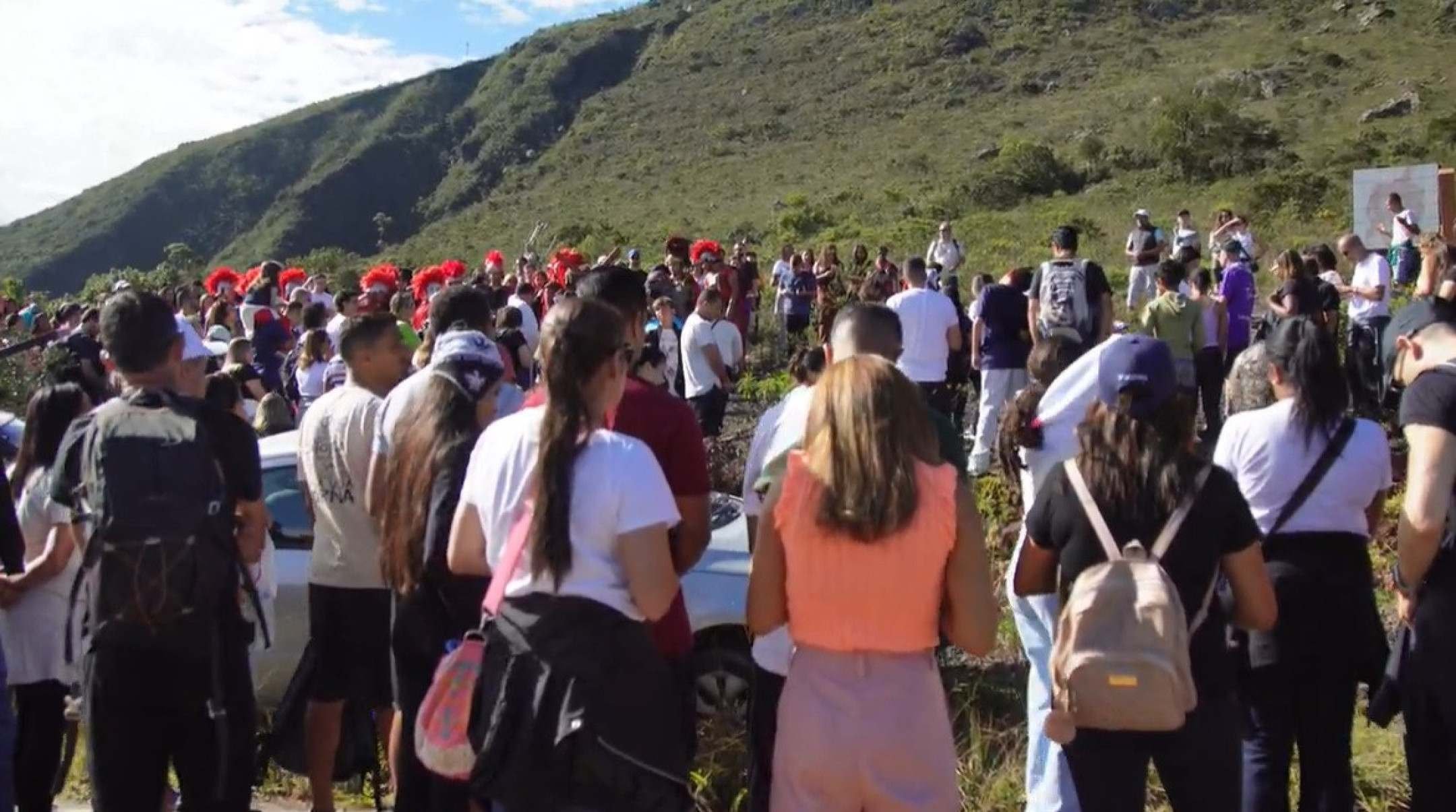 O percurso ocorreu com céu claro, sem a costumeira neblina que costuma “cobrir” o maciço nas primeiras horas do dia – da portaria à Praça da Cavalhada (estação), os romeiros foram a pé, depois, alguns seguiram de van até as proximidades da basílica.
