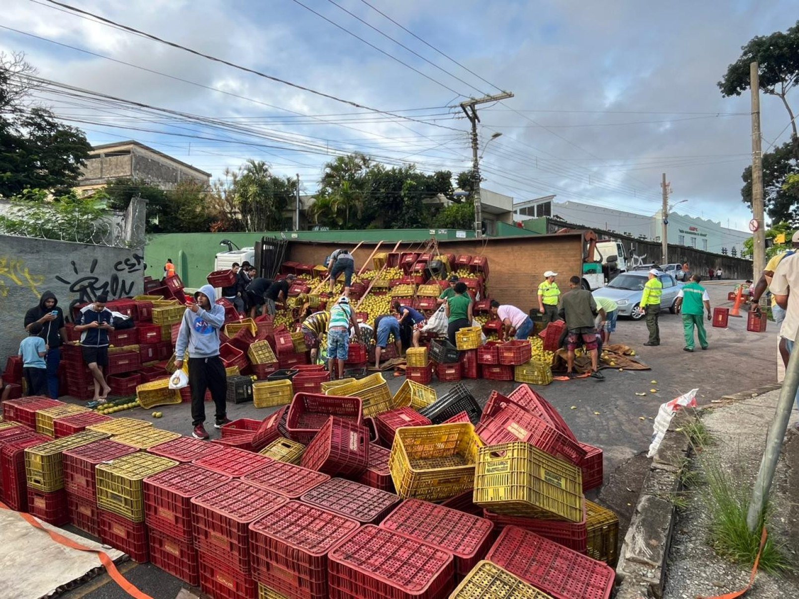 Na manhã desta segunda-feira, um guincho atuava no destombamento do veículo, enquanto populares saqueavam a carga espalhada pela via.