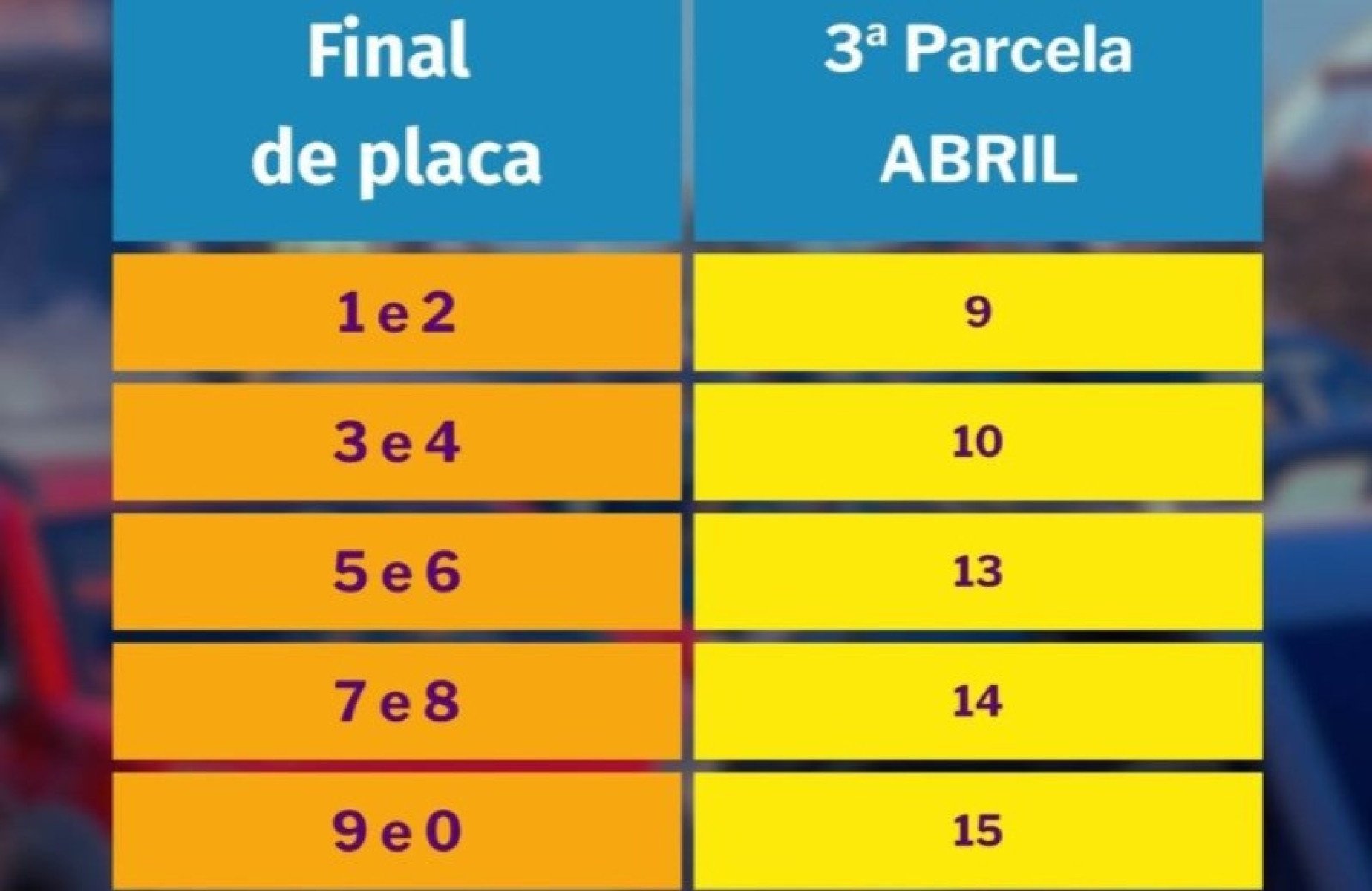 Para placas com final 5 e 6, o prazo é na próxima segunda-feira (13/4). Finais 7 e 8 têm vencimento para terça-feira (14/4) e finais 9 e 0 para quarta-feira (15/4).