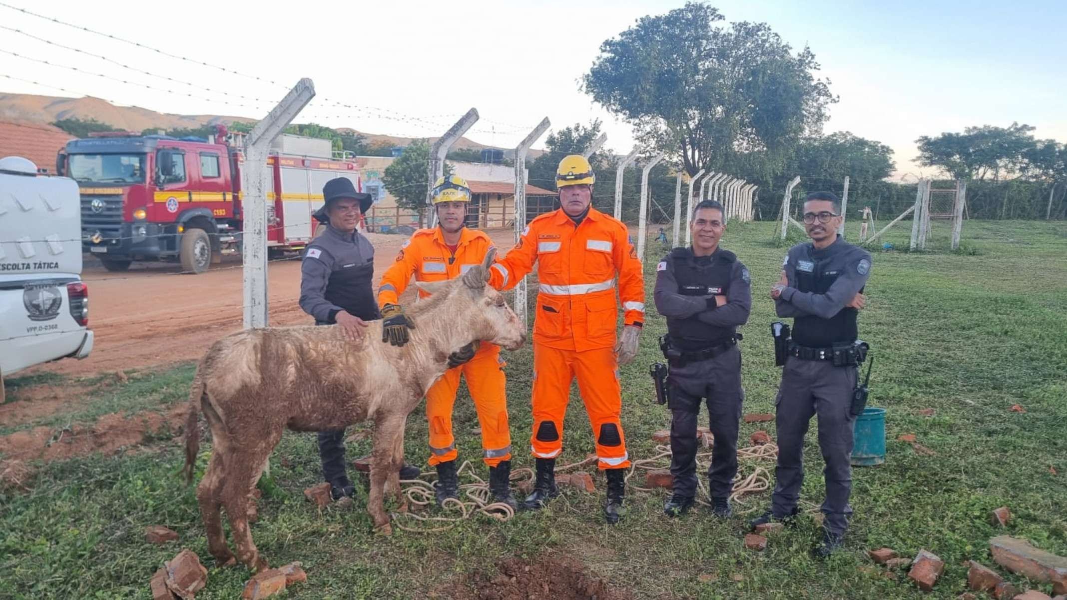 Um jumento foi resgatado, na tarde dessa terça-feira (7/4), ao cair em um bueiro em frente ao Presídio de Segurança Máxima de Francisco Sá (MG), Região Norte do estado.