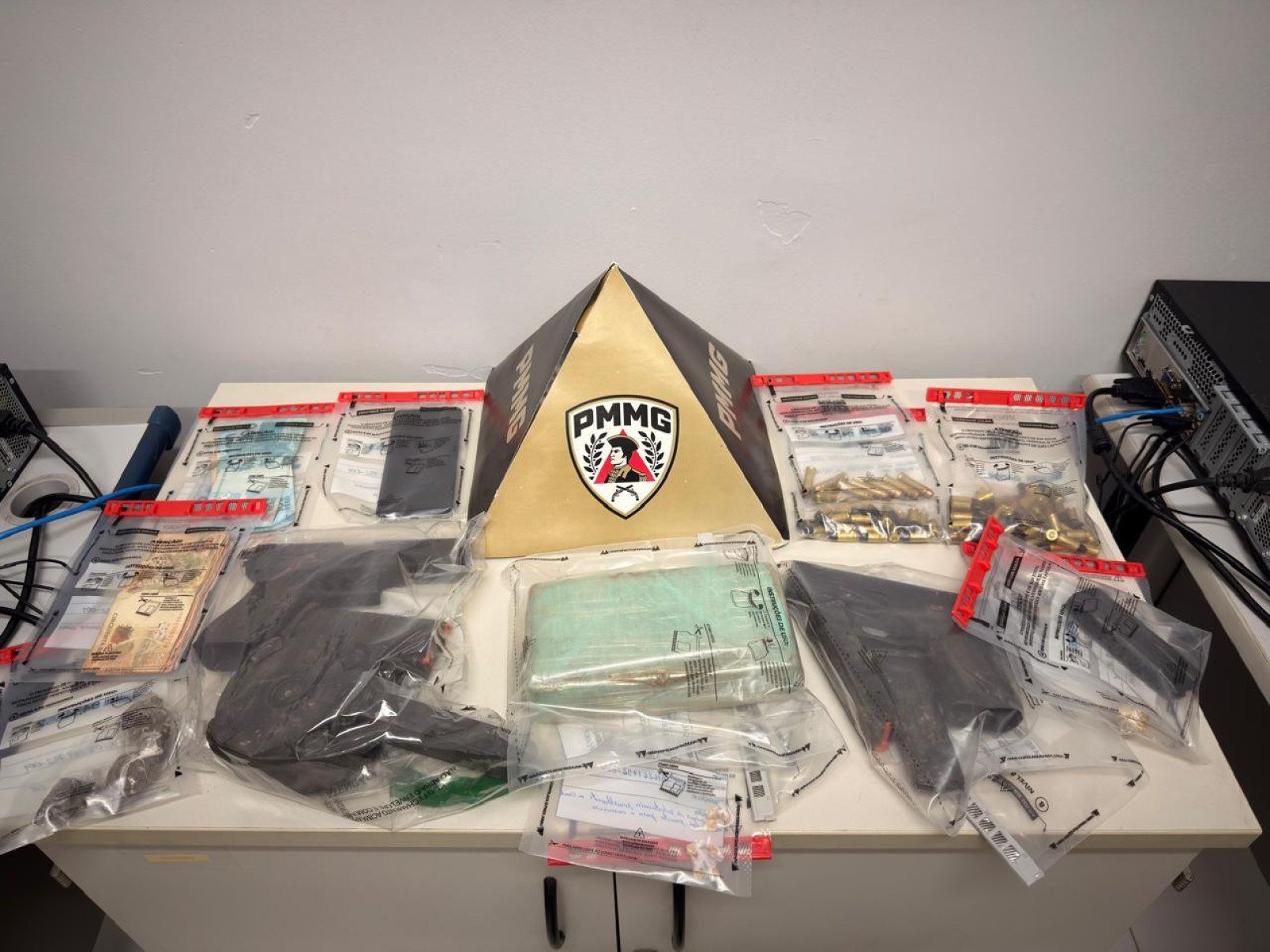 Ainda conforme a ocorrência, Winícius indicou aos militares um ponto próximo ao Rio Doce onde haveria mais produtos ilícitos escondidos. Com o auxílio de uma cadela farejadora, foram localizados tonéis enterrados contendo duas pistolas Glock, dezenas de munições de diferentes calibres, carregadores, incluindo um tipo caracol, e uma barra de aproximadamente um quilo de crack.