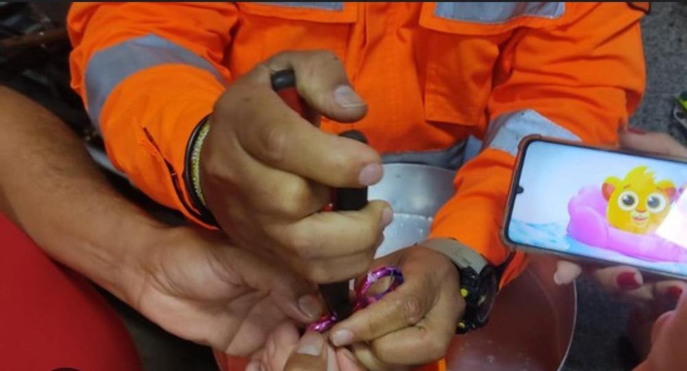 A mãe da criança a levou até o Corpo de Bombeiros para que o objeto fosse retirado. Utilizando um corta-anel, os militares removeram o objeto.