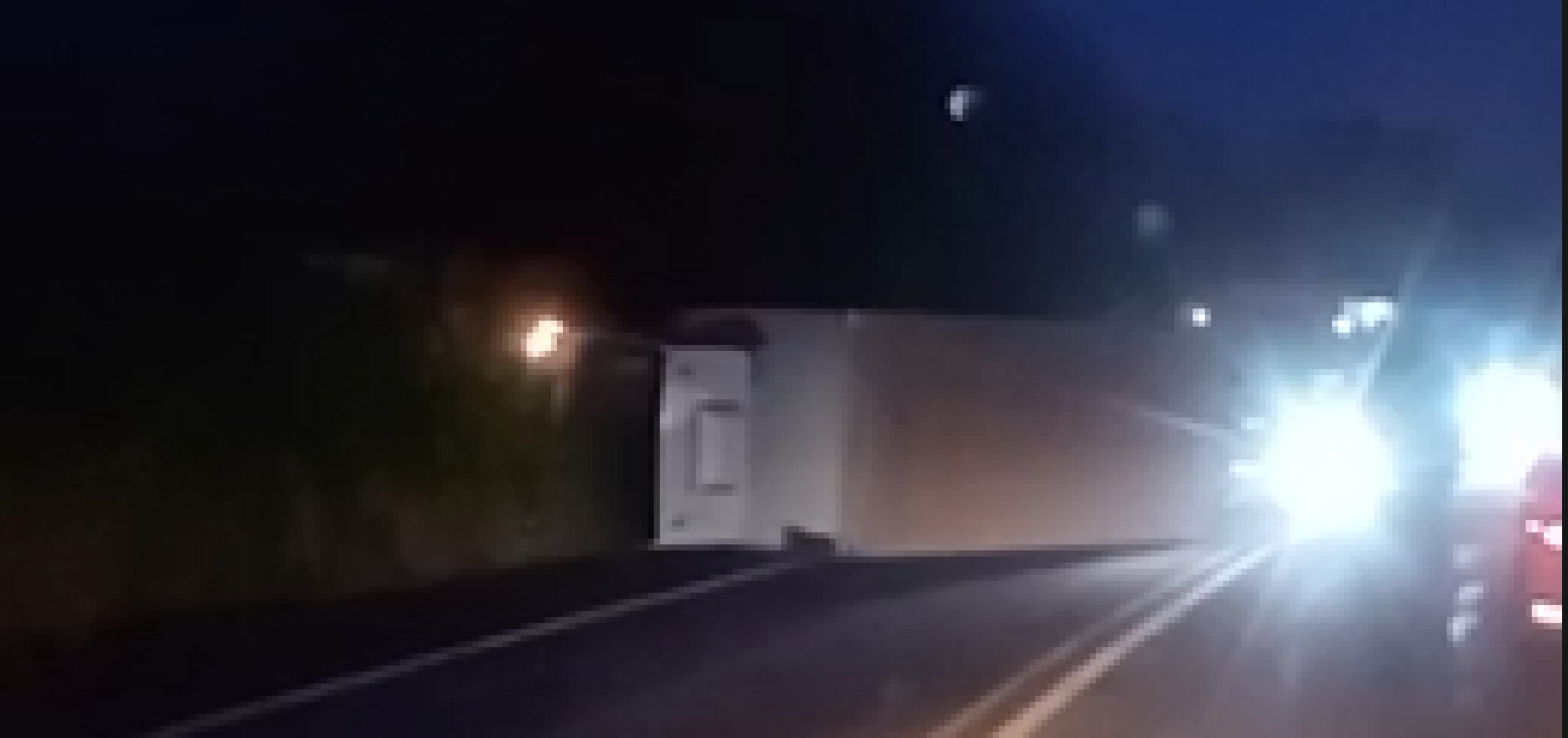 De acordo com as informações iniciais, um caminhão baú de pequeno porte tombou na pista por motivos ainda desconhecidos. Não houve registro de vítimas.