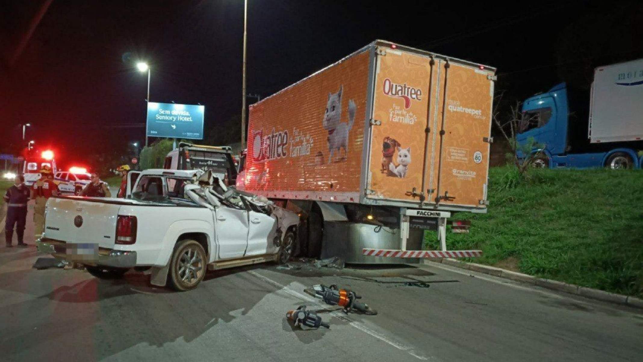 De acordo com a corporação, a mulher estava no banco do passageiro e morreu no local. A frente da caminhonete ficou completamente destruída, parte dela entrou embaixo do caminhão. Conforme relatado aos bombeiros que foram ao local do acidente, o caminhão, levado por um guincho, estava parado no lado direito da via no momento em que a caminhonete colidiu na traseira dele.