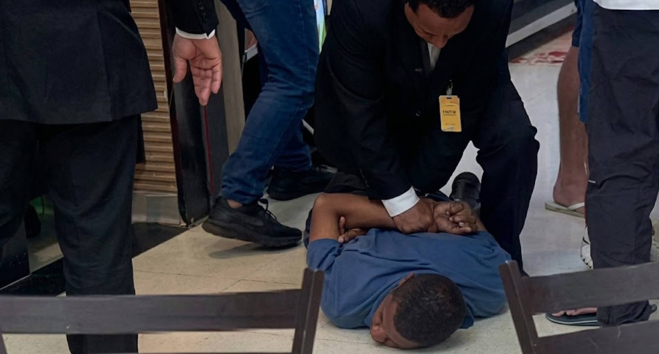 Ao mesmo tempo, um grupo de seguranças do estabelecimento agiu rápido, cercando e imobilizando no solo o suspeito.