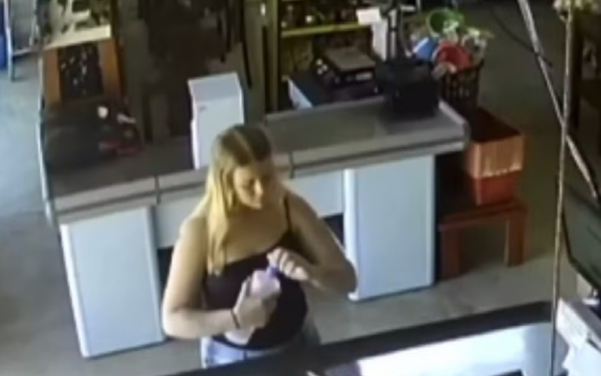 As imagens mostram o momento em que Marcela entra na mercearia, compra um frasco de álcool e fósforos e, ao passar no caixa onde a vítima estava trabalhando, joga o líquido sobre a jovem e ateia fogo.