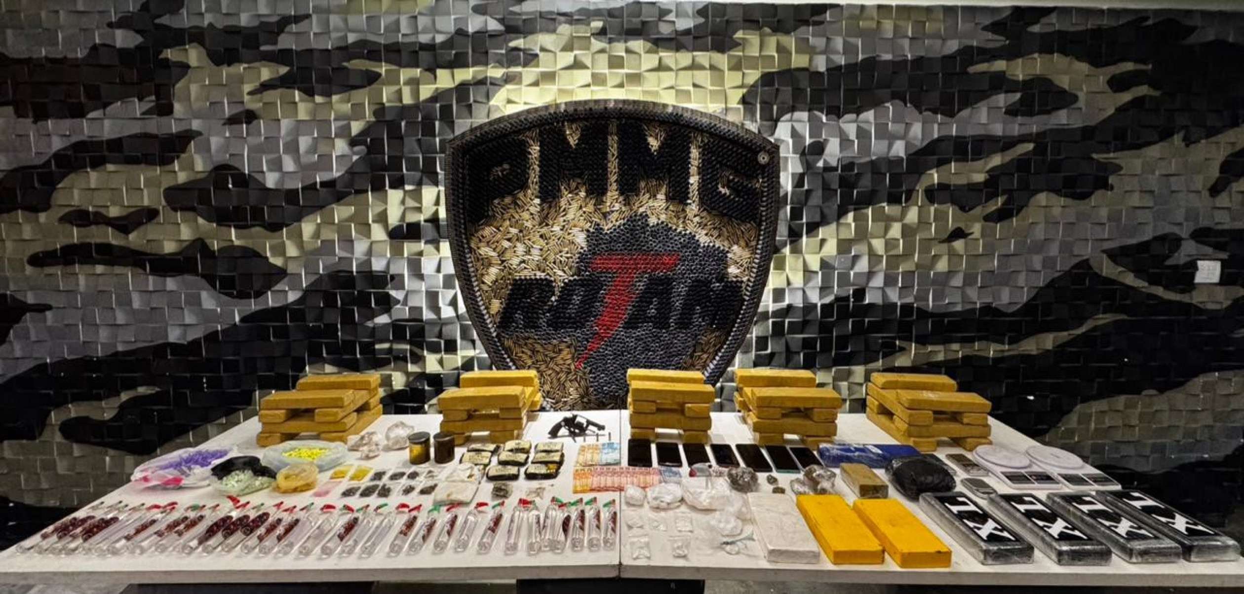 Durante a operação, os militares apreenderam uma grande quantidade de entorpecentes, incluindo 41 barras de maconha, 9 barras de cocaína, porções de drogas sintéticas como ice, crumble e dry, além de 1.342 comprimidos de ecstasy e 33 frascos de lança-perfume.