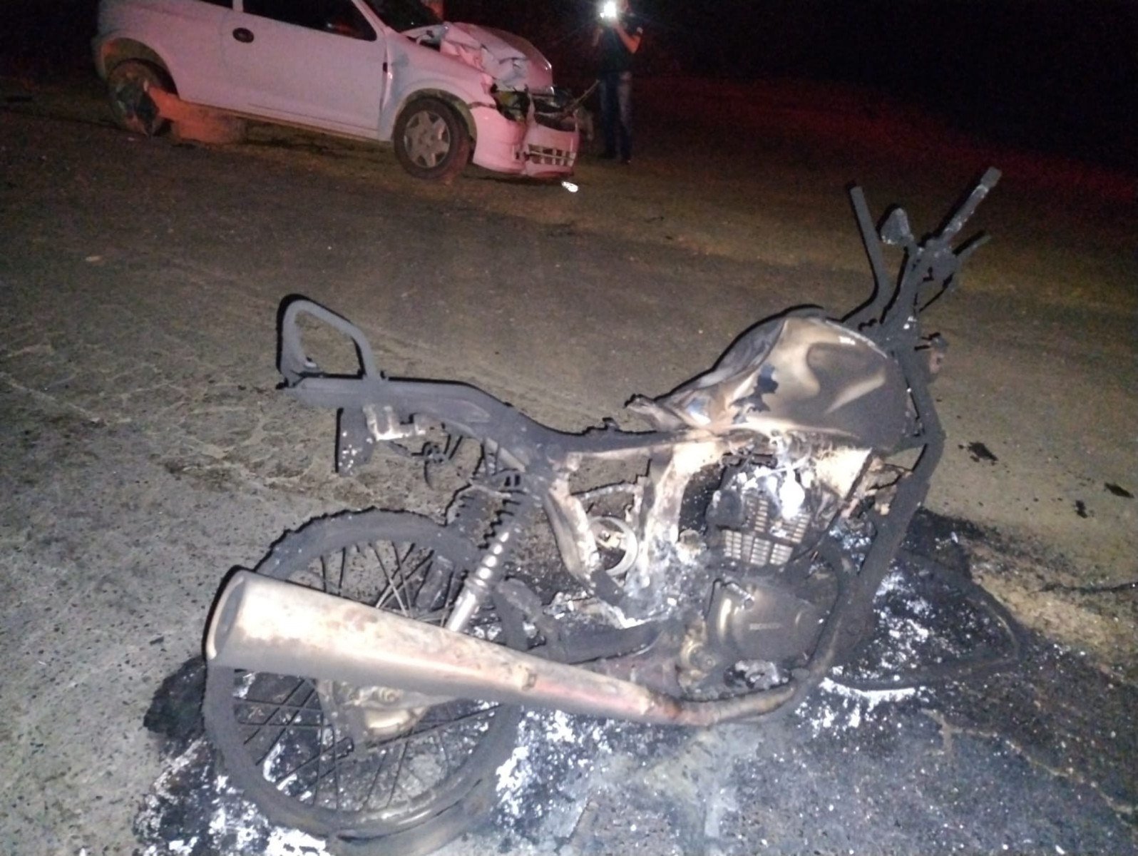 No impacto, a moto pegou fogo e ficou destruída. A perícia da Polícia Civil coletou informações no local do acidente e liberou os veículos. O automóvel foi retirado pela condutora e a motocicleta foi removida por não haver responsável no local.