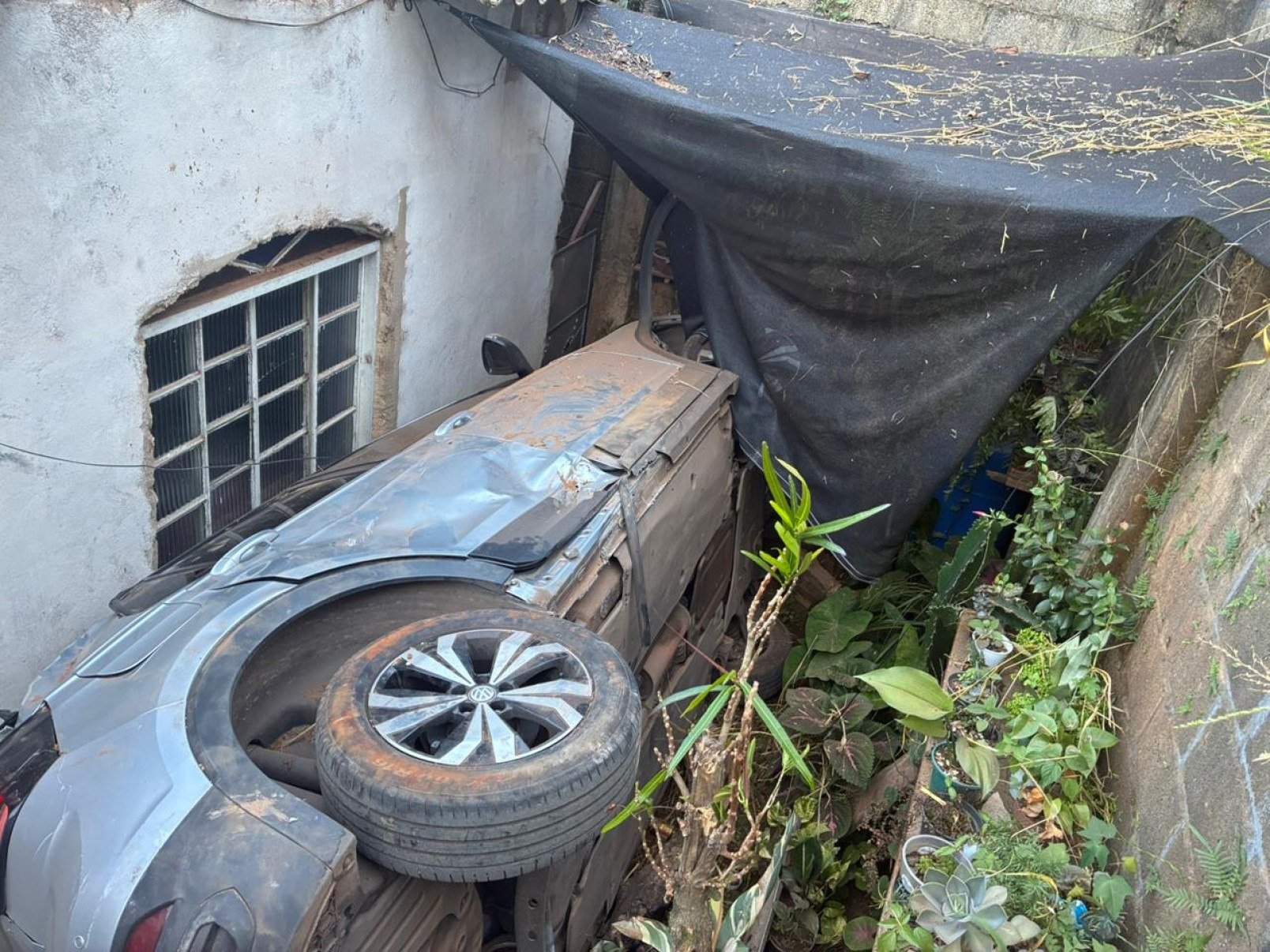 Uma motorista perdeu o controle do carro, desceu um barranco e o veículo ficou preso entre duas residências na tarde desta terça-feira (28/4), no Bairro Adelmolândia, em Sabará (MG), na Região Metropolitana de Belo Horizonte.