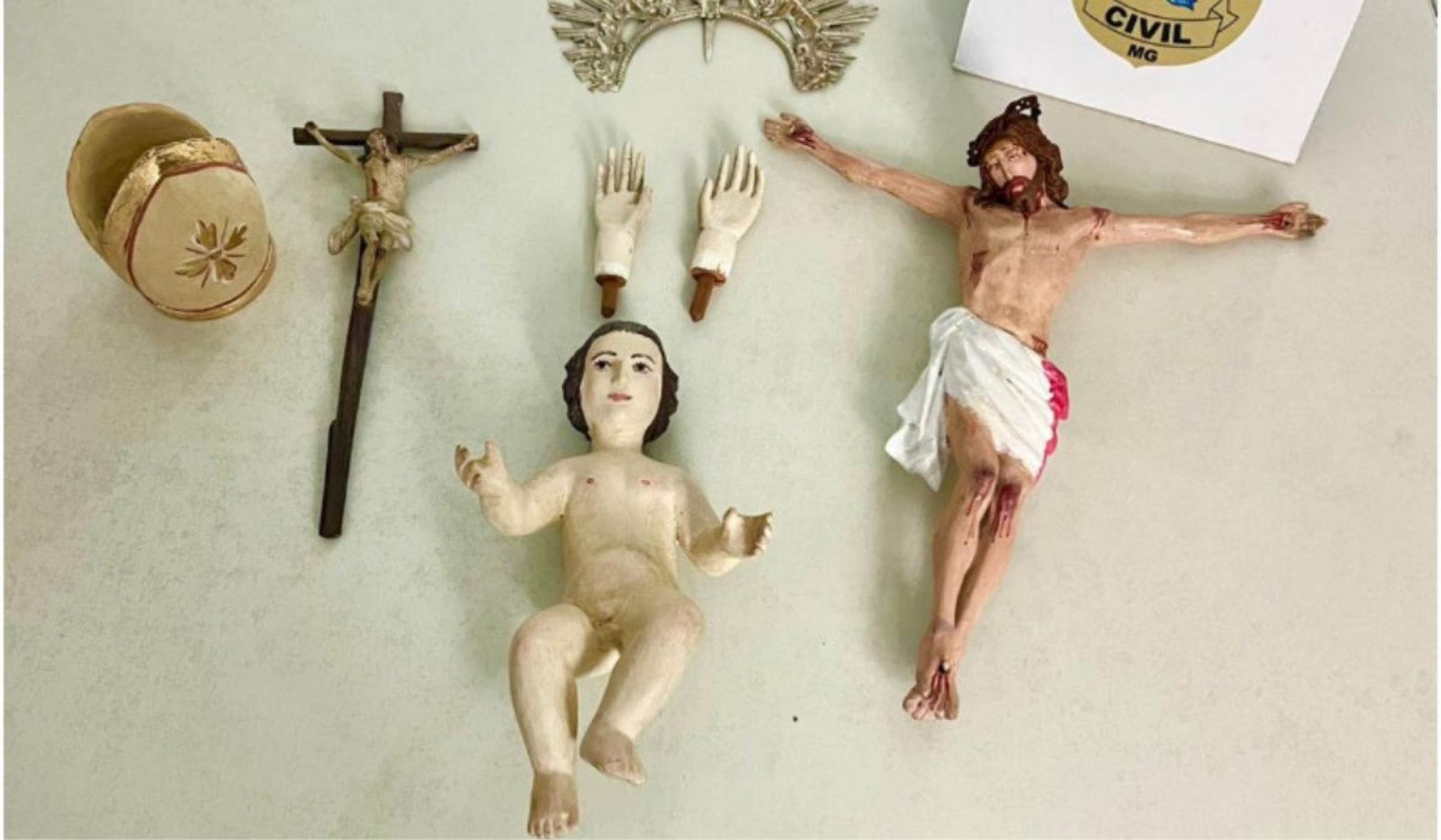 Os furtos foram registrados em 23 de março e 20 de abril. Nos levantamentos da delegacia em Campo Belo, os policiais civis localizaram, na residência do investigado, imagens do Cristo crucificado e do Menino Jesus, além de um crucifixo, partes integrantes de outra imagem religiosa, como mãos destacadas e ornamentos litúrgicos, a exemplo de resplendor e mitra episcopal.