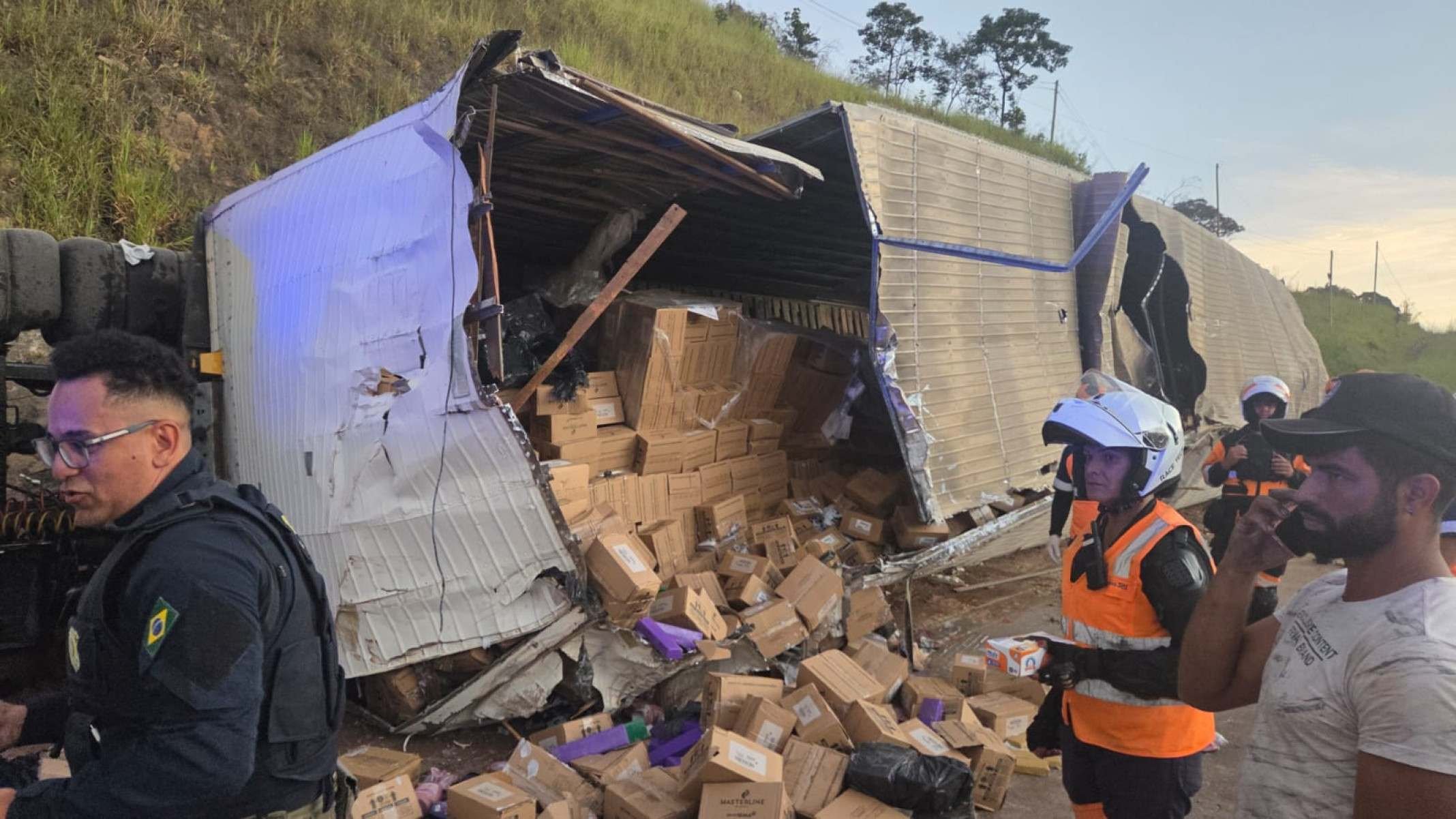 Parte da carga de cosméticos foi saqueada por pessoas que passaram pelo local antes da chegada das equipes, a PRF identificou divergências no Manifesto Eletrônico de Documentos Fiscais (MDF-e), incluindo inconsistência entre o veículo informado e o efetivamente envolvido no acidente.